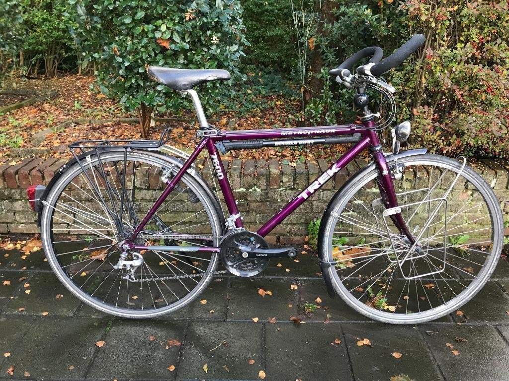 Mooie fiets van Trek uit 1993, inclusief dragers voor €195. De fiets is goed onderhouden met paar gebruikssporen zoals schuimrubber op het stuur beschadigd en sticker op het frame.
