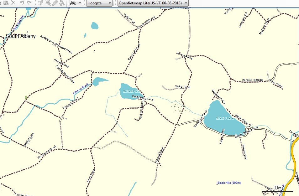 Ik heb een ander stukje van mijn route genomen om met verschillende kaarten te vergelijken. Het zijn twee dagetappes -samen 213 km en 3100 hm- door de staat Vermont, uitgezet met RWGPS https://ridewithgps.com/routes/28271439