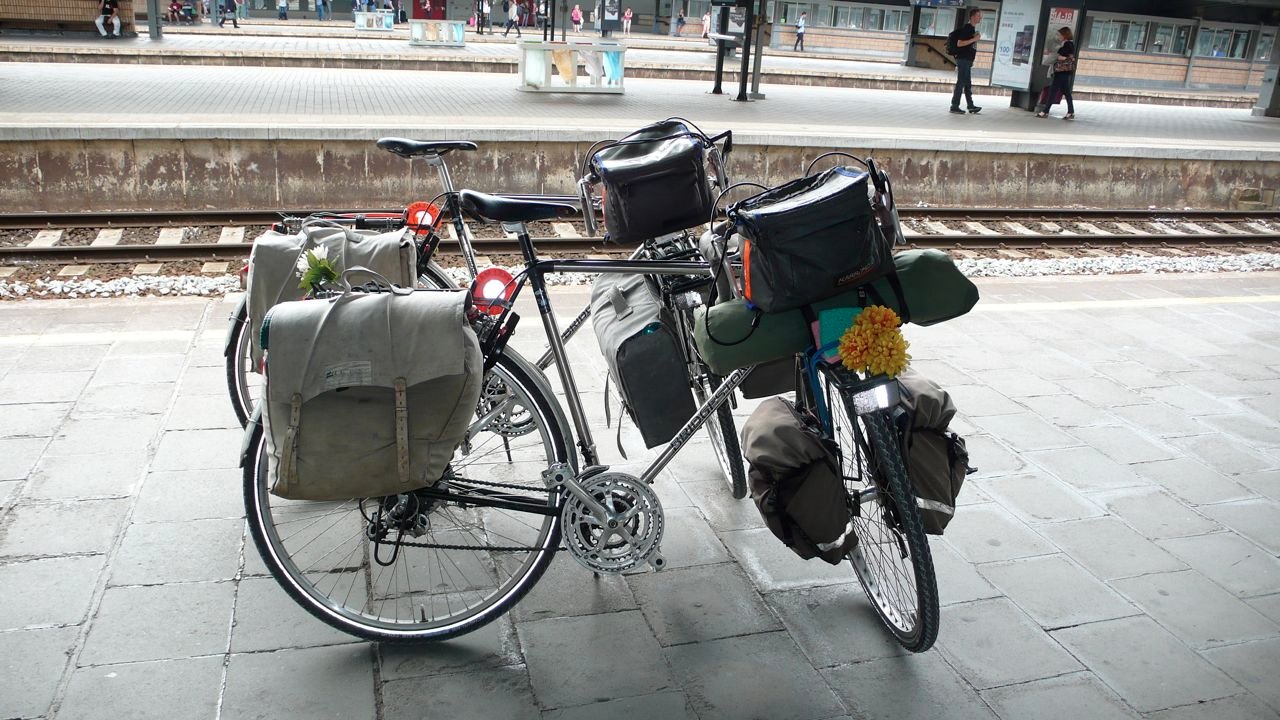 Onlangs een tweedehands Koga Randonneur model 2010 gekocht en uitgerust met tweedehands Ortlieb tassen van wat oudere modellen. Alleen de stuurtas is nieuw. Het groen-gele pakket achterop is mijn opvouwbare stoel, een luxe die 1,4 kilo kost. Verder heb ik tamelijk lichtgewicht gefietst. Voor vertrek heb ik een paar modificaties aan de fiets uitgevoerd: Een paar nieuwe 40mm Schwalbe Almotion Supreme banden gemonteerd, zadel vervangen door een Brooks B17, pedalen vervangen dooor Shimano M324 combipedalen, en het vlinderstuur vervangen door een mountainbikestuur met bar-end-grips. Ik paste met mijn handen niet op het vlinderstuur. Bovendien vind ik het er niet uit zien. Maar toch ben ik nog niet tevreden, want ik kreeg flink last van mijn handen na een paar dagen. Dus nog even prutsen aan de afstelling, of toch een ander stuur. Ik fiets graag met een racebocht, maar het overzetten van V-brakes en versnellingshandels levert allerlei technische complicaties op. Nog eens even op studeren, dus. De fiets rijdt verder als een trein (uit principe worden elektrische fietsers ingehaald, ook met bagage, al lukt dat meestal niet bij Pedelecs).