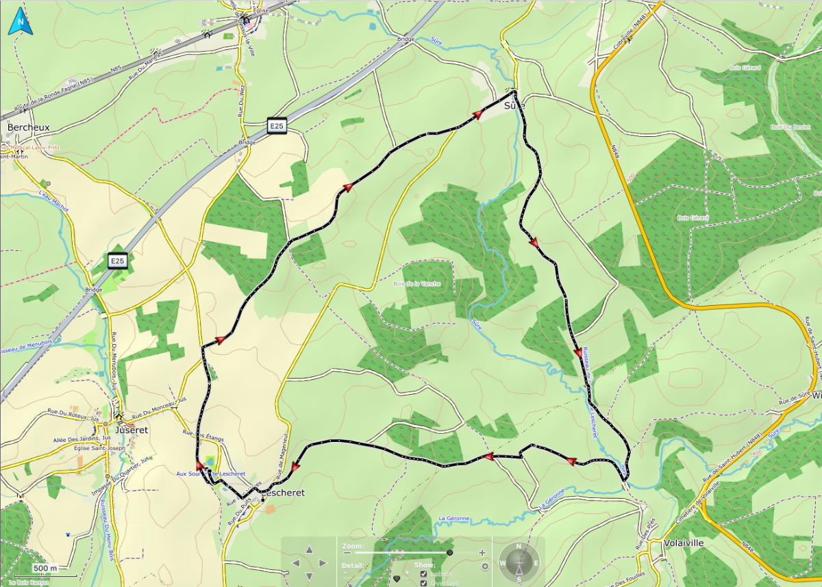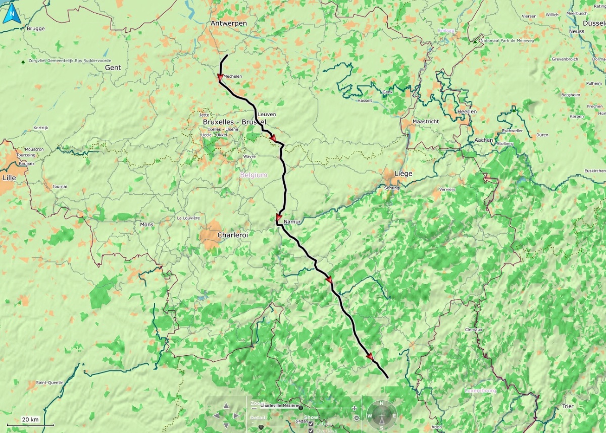 Na Namen begon ik de route te volgen die Google maps mij had voorgerekend in fietsmodus. Voorheen volgde ik de Garmin routering van OFM met optie "tolwegen vermijden", maar na Namen maakte die zo'n omwegen dat ik voor de snellere Google variant had gekozen. Dit was een pijnlijke misrekening; de fietsroute van Google ging eerst verschillende km's over een 4-vaks baan waar je 90 mag, om af en toe parallel aan deze baan te gaan rijden op MTB paden. Uiteindelijk ben ik op het gevoel weg beginnen rijden van deze grote baan om nadien de eTrex 20x terug de weg laten zoeken (zonder "tolwegen vermijden" omdat dat teveel omweg was) toen ik ver genoeg van deze drukke verkeersas verwijderd was.