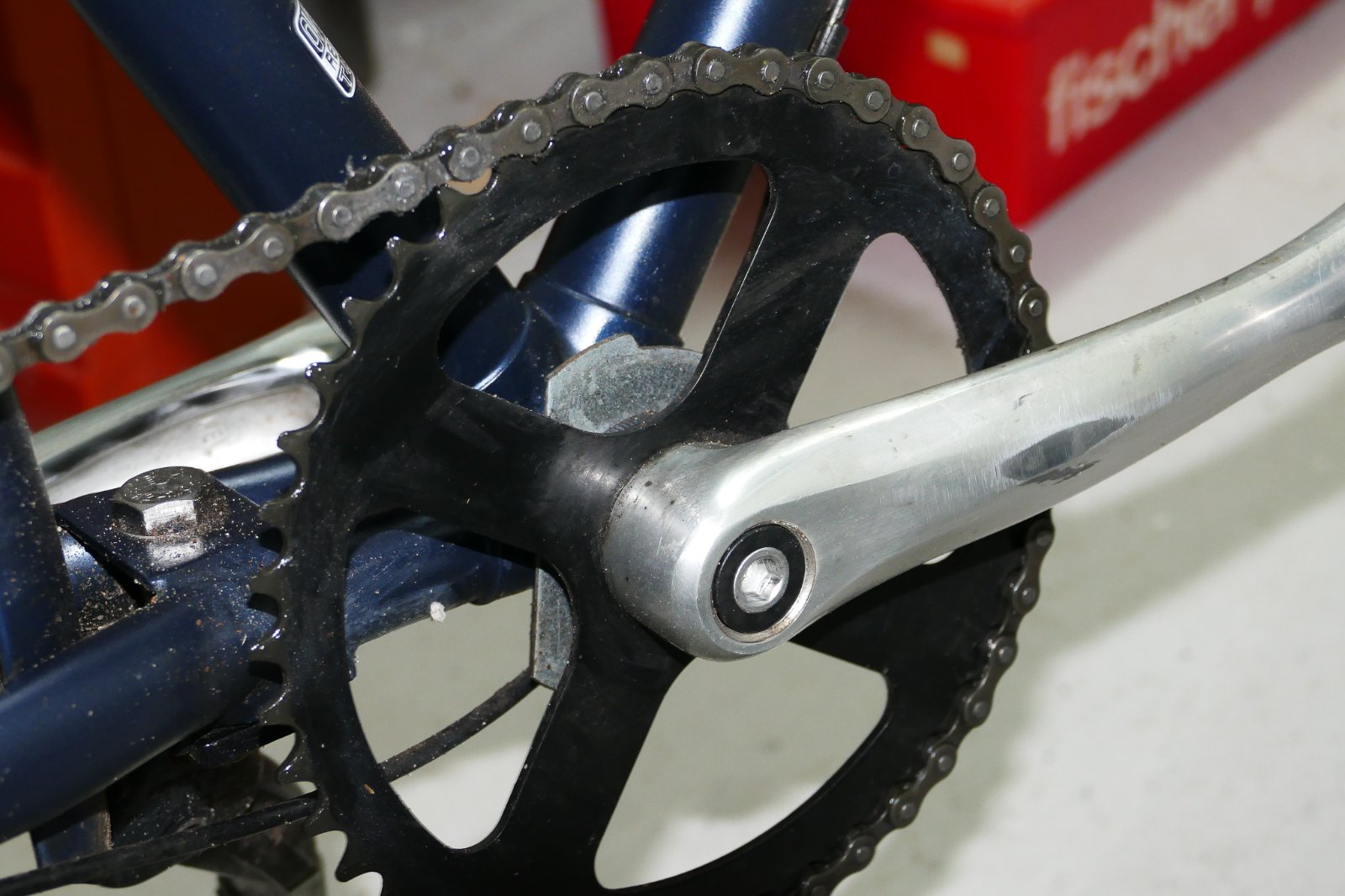 Na 5000 km was hij uitgesteld en heeft de fietsenmaker er 2 schakels uitgehaald.
