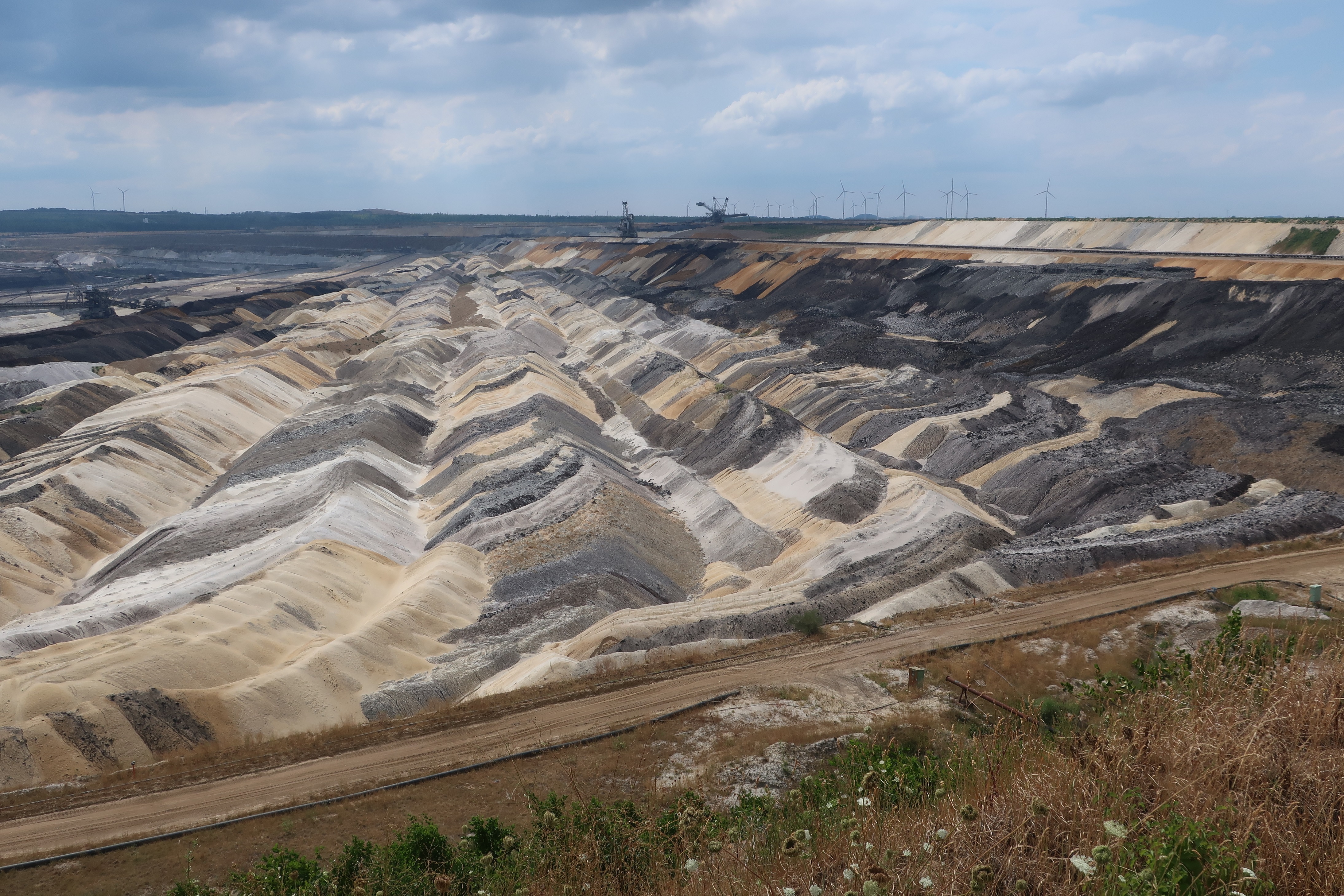 Leon heeft het goed. Het is de rij sproeiers die langs een groot deel van de oostzijde van de bruinkoolgroeve Inden staan. Ik denk dat het de bedoeling is dat ze voorkomen dat de naastgelegen dorpen onder het stof komen dat overwaait uit de groeve bij westenwind. Ik vind het altijd wel het uitzicht waard om even van de Rur-fietsroute af te wijken om dit mega-gat te zien.