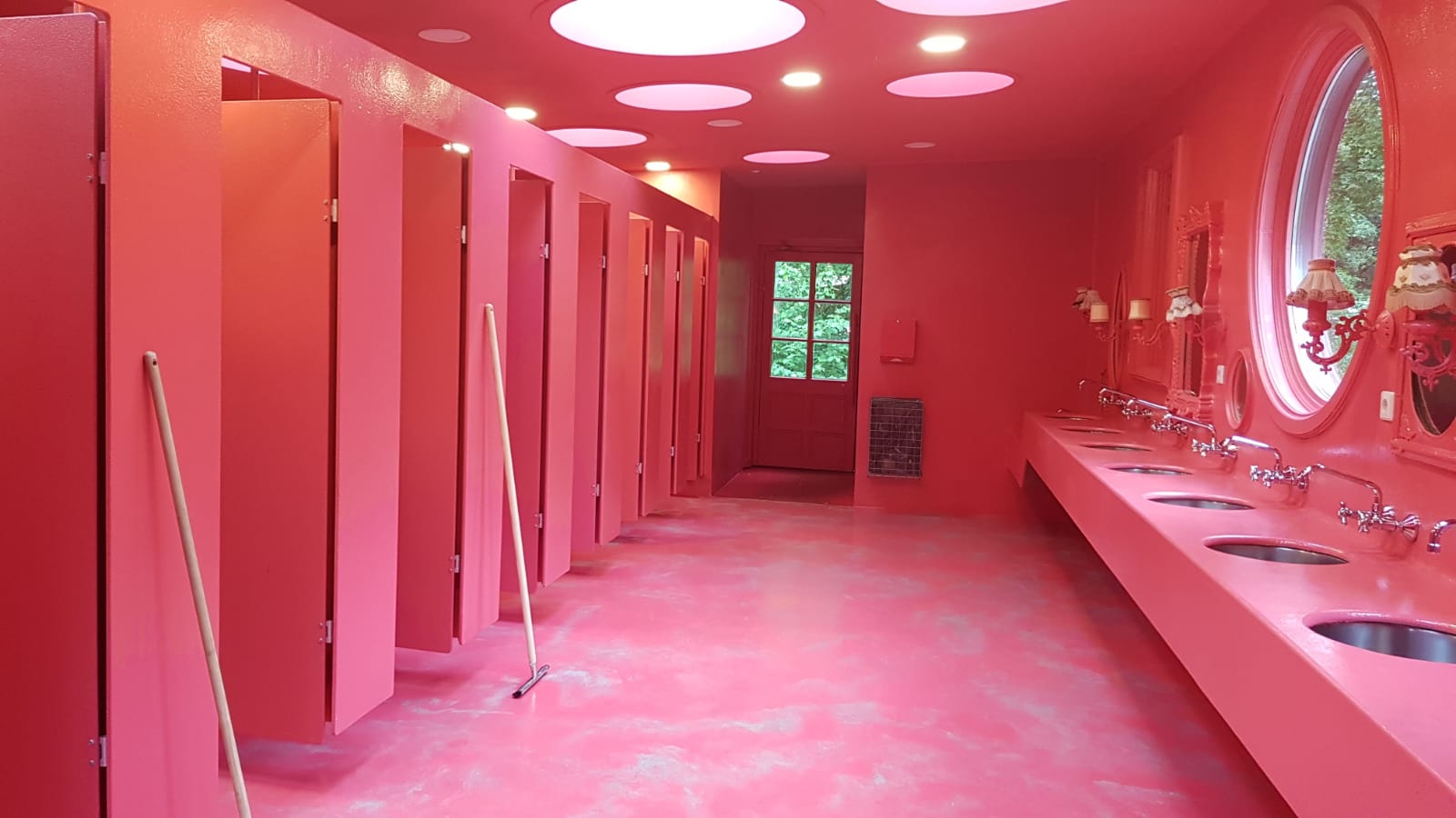 Ik was op mijn laatste fietstocht door Nederland (10 provinciën route, wederom met dank voor de inspiratie aan Hans van der Veeke) op een camping aangeland met wel zeer bijzondere kleurstelling in de doucheruimtes. Overigens zeer verzorgd! Dat wel... De vloer komt er niet helemaal uit want dat zijn in werkelijkheid dus glitters.