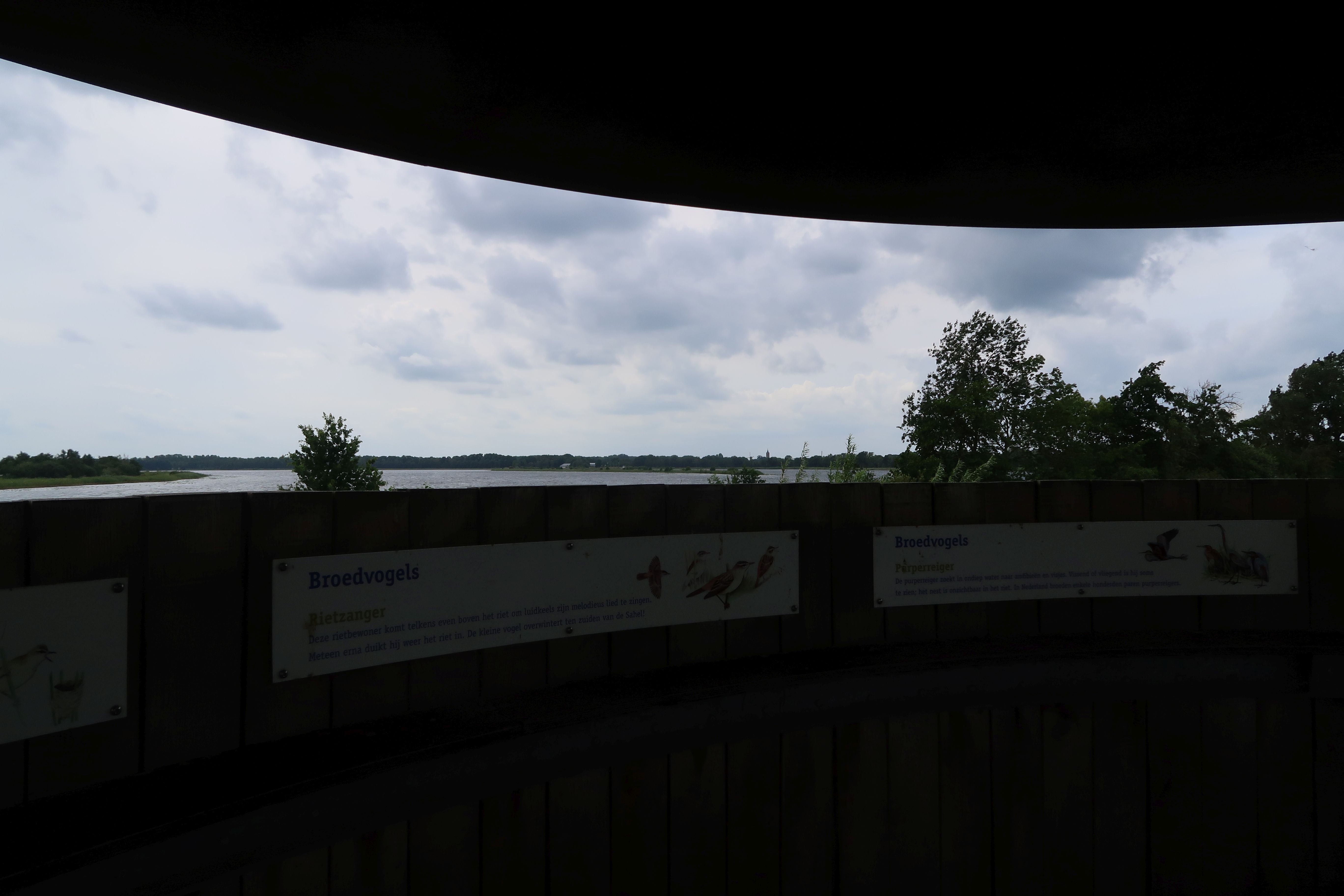 Ik zie op de achtergrond een Naarden Vesting-achtige kerktoren, maar ook twee molens. Maar Naarden heeft geen molens, De toren lijkt anders wel op de St. Jan in Schiedam. Gekeken op de kaart van Natuurmonumenten (waarvan de informatieborden in hun stijl worden weergegeven). Ik gok op het natuurgebied Rietputten bij Vlaardingen. Klopt dat?