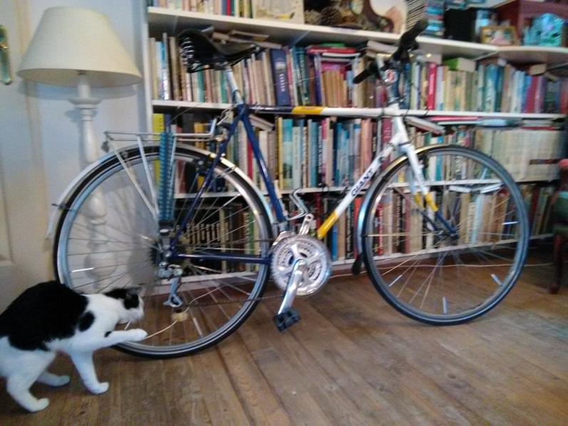 hoe-was-het-nou-weer waar de onderdelen thuis horen. Foto's van de fiets in de oude situatie bekeken. En dan verder aan de slag. Vanwege het slechte weer deed ik het werk gewoon in de huiskamer. Nieuw zijn de cranks en de drie voorbladen. Ook nieuwe kabels voor remmen en derailleurs, maar uit eigen voorraad. Totale kosten nog geen 90 euro. Zoals al gezegd, is de voordrager komen te vervallen. Van de (bestaande) ketting heb ik vier schakels verwijderd, vanwege het kleinste voorblad, dat er eerst niet was. Helaas is de foto niet zo scherp, want als ik de flits zou gebruiken, slaan de reflecties van de banden en de spaken fel terug. Alleen de derailleurs zijn nog niet afgesteld, poes Sientje speelde op de foto aan de loshangende kabel van de achterderailleur, welke ik nog moet doorknippen.