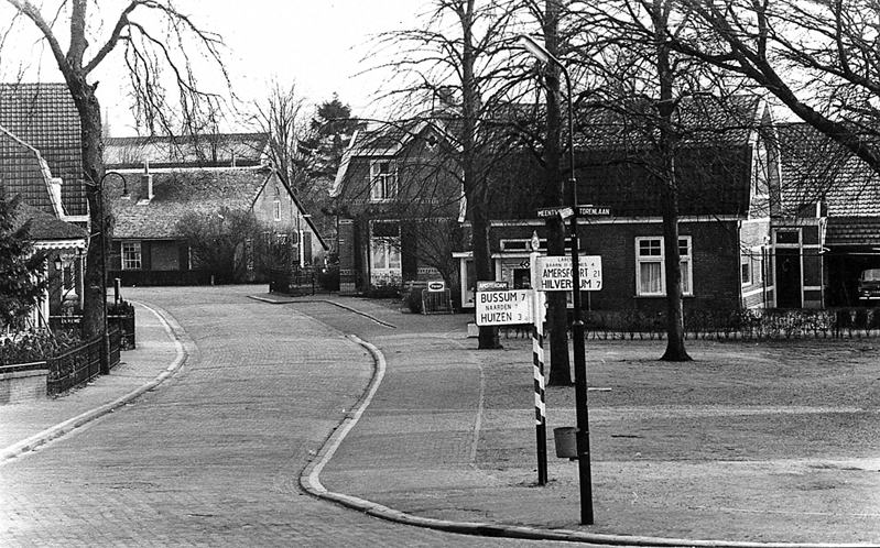 Jullie hebben de andere Blaricumse wegwijzer met mijn ouderlijke huis op de achtergrond al gezien. Hier dezelfde wegwijzer op 16 januari 1972 in tegengestelde richting vanuit mijn huis gefotografeerd, maar nog wél met het oranje Amsterdam-bordje erop.