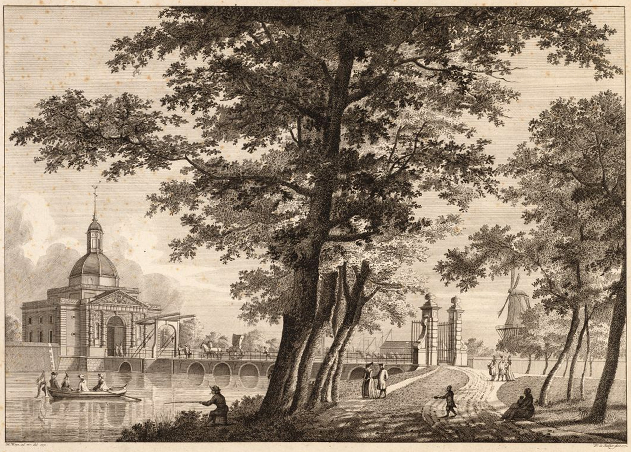 Dezelfde hekkepoort nog als hamei bij de Muiderpoort. De molen op de achtergrond is korenmolen De Ruyter, gebouwd in 1660 en gesloopt in 1863. Dit is dus niet de nog bestaande De Gooyer, die wat verderop staat. https://www.molendatabase.org/molendb.p ... ummer=4557