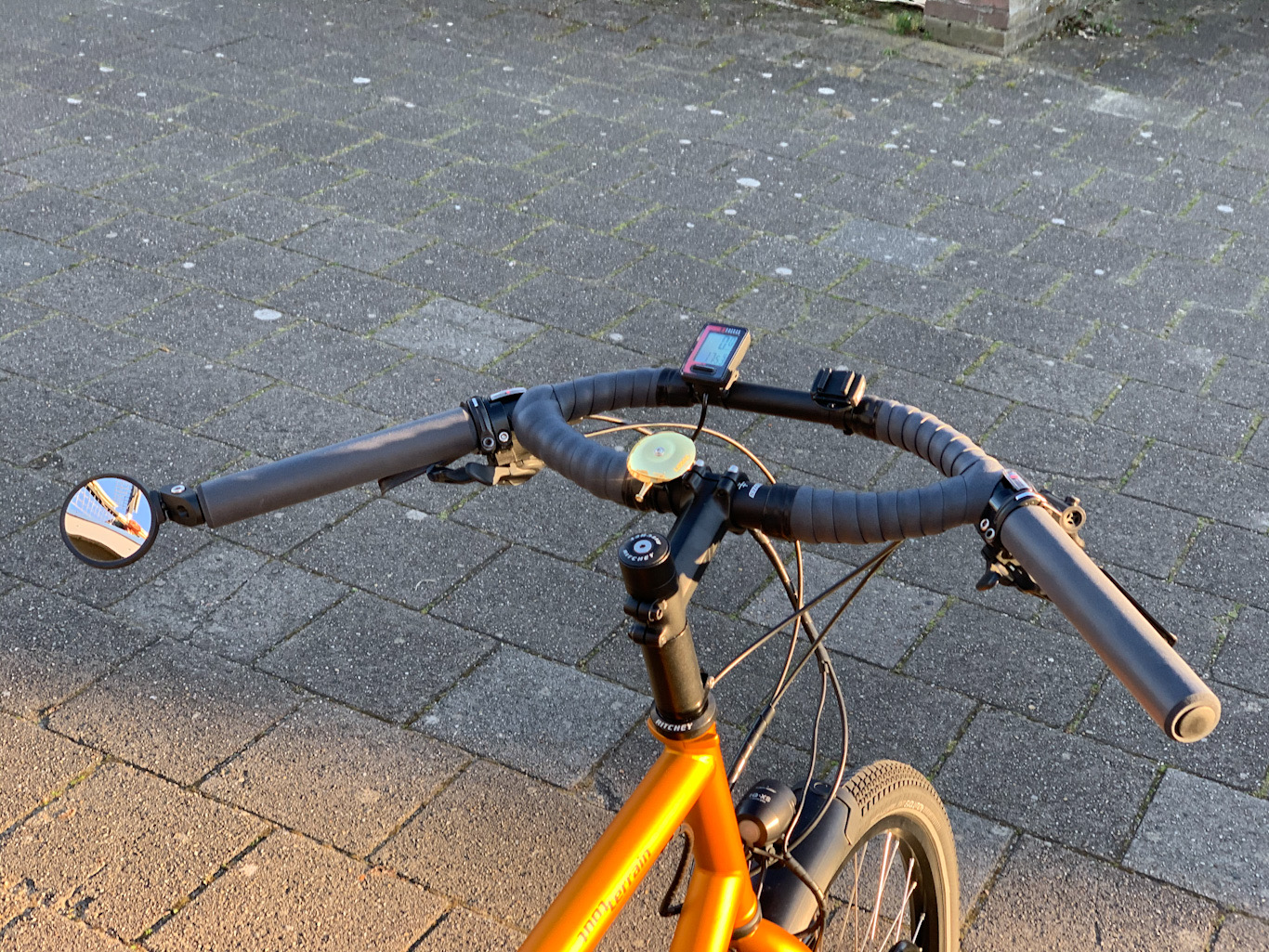 En als laatste een Jones bar met ESI extra chunky grips, ESI stuurlint en een Lezyne brass bell.
