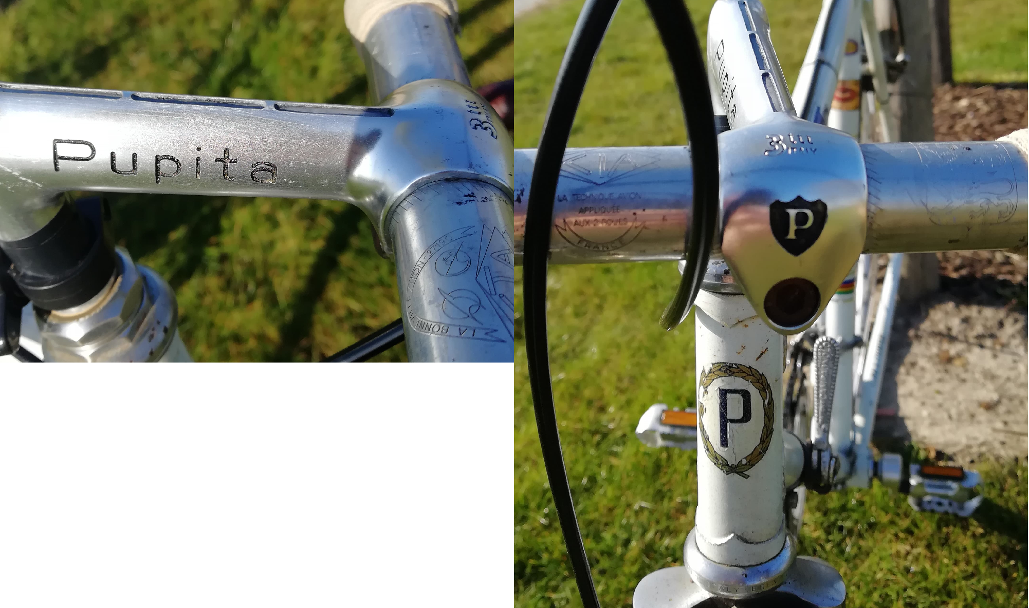 Pupita Sport is een Italiaanse winkel die nog steeds bestaat (je zou ze kunnen aanschrijven voor info). De kwaliteit van het kader is aan de hand van deze foto's moeilijk in te schatten maar het zal in zijn tijd wel een dure fiets geweest zijn: uitgerust met Campagnolo nuevo record plus gepantografeerde stuurpen. Pupita Sport zal een aantal van die kaders afgenomen hebben van een al dan niet bekende framebouwer en die onder eigen naam verkocht hebben, dat was een normale gang van zaken. Die vorkkroon is typisch voor Legnano, maar ongetwijfeld ook voor anderen. Met goeie detailfoto's kan de origine van het frame misschien wel achterhaald worden (door kenners op gespecialiseerde fora).