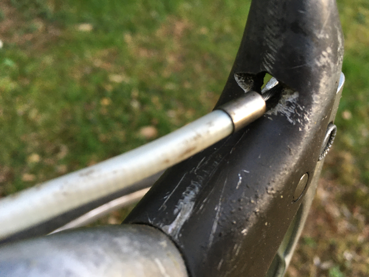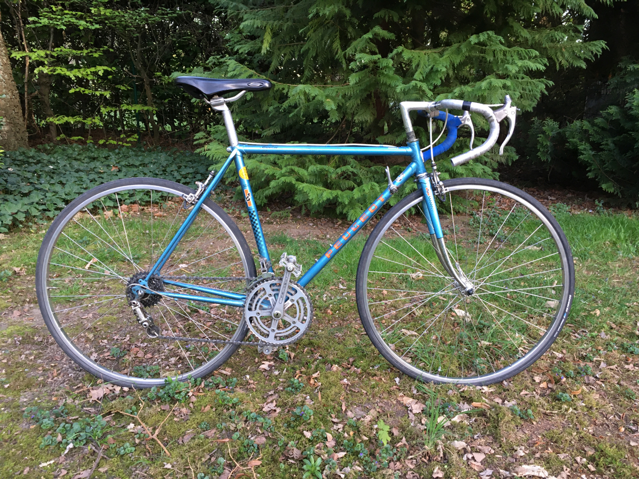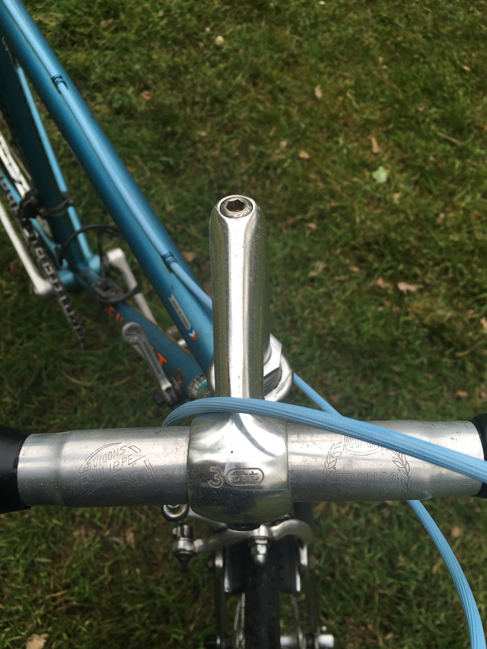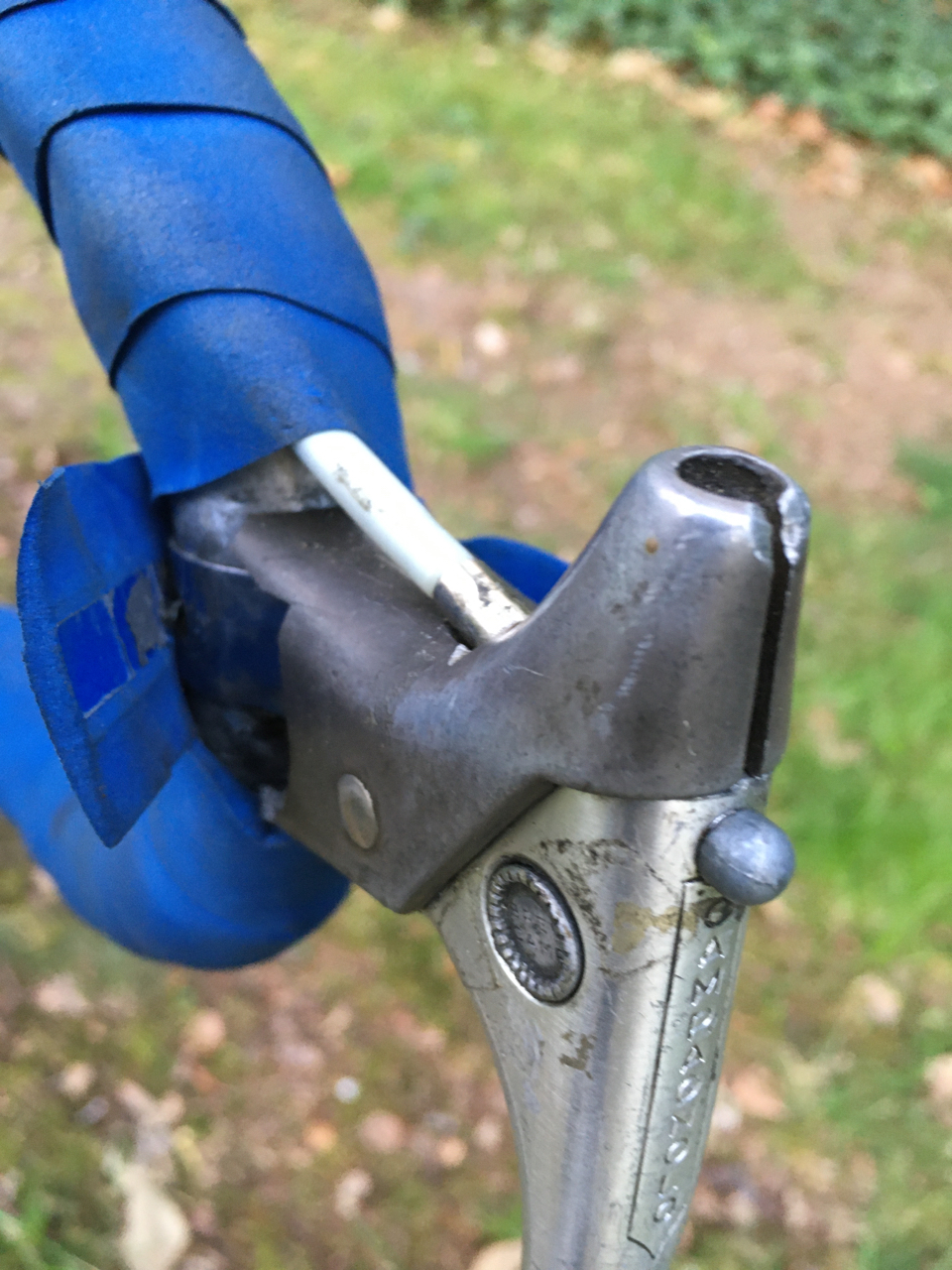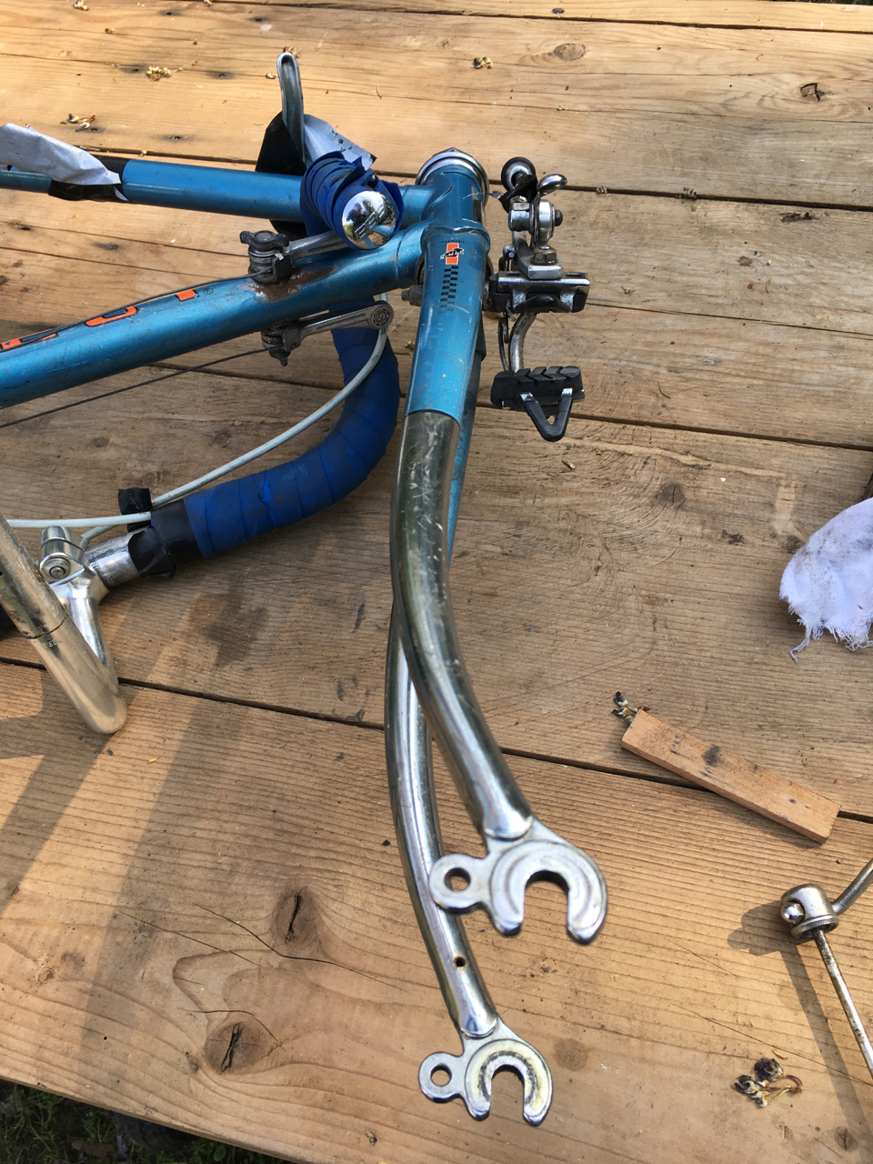 Die aero-hackjob heb ik dus maar teniet gedaan. NOS lichtblauwe kabeltjes gekocht en erzats-rubbers voor de remgrepen. In de zadelbak heb ik nog een oud San Marco zadel gevonden dat veel beter zit, alleen spijtig dat er een hap uit is. Bruin stuurlint is besteld maar nog niet aangekomen.