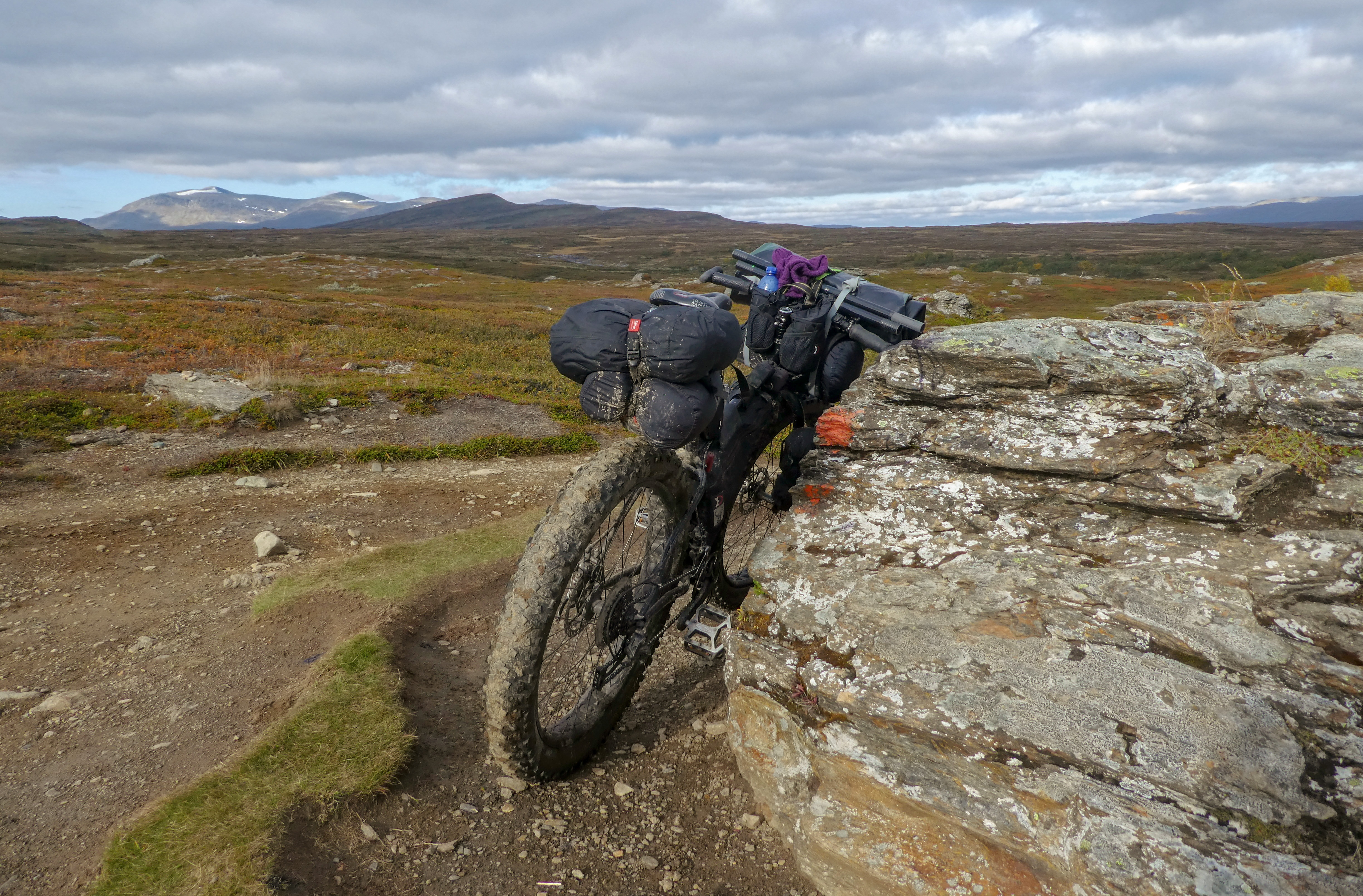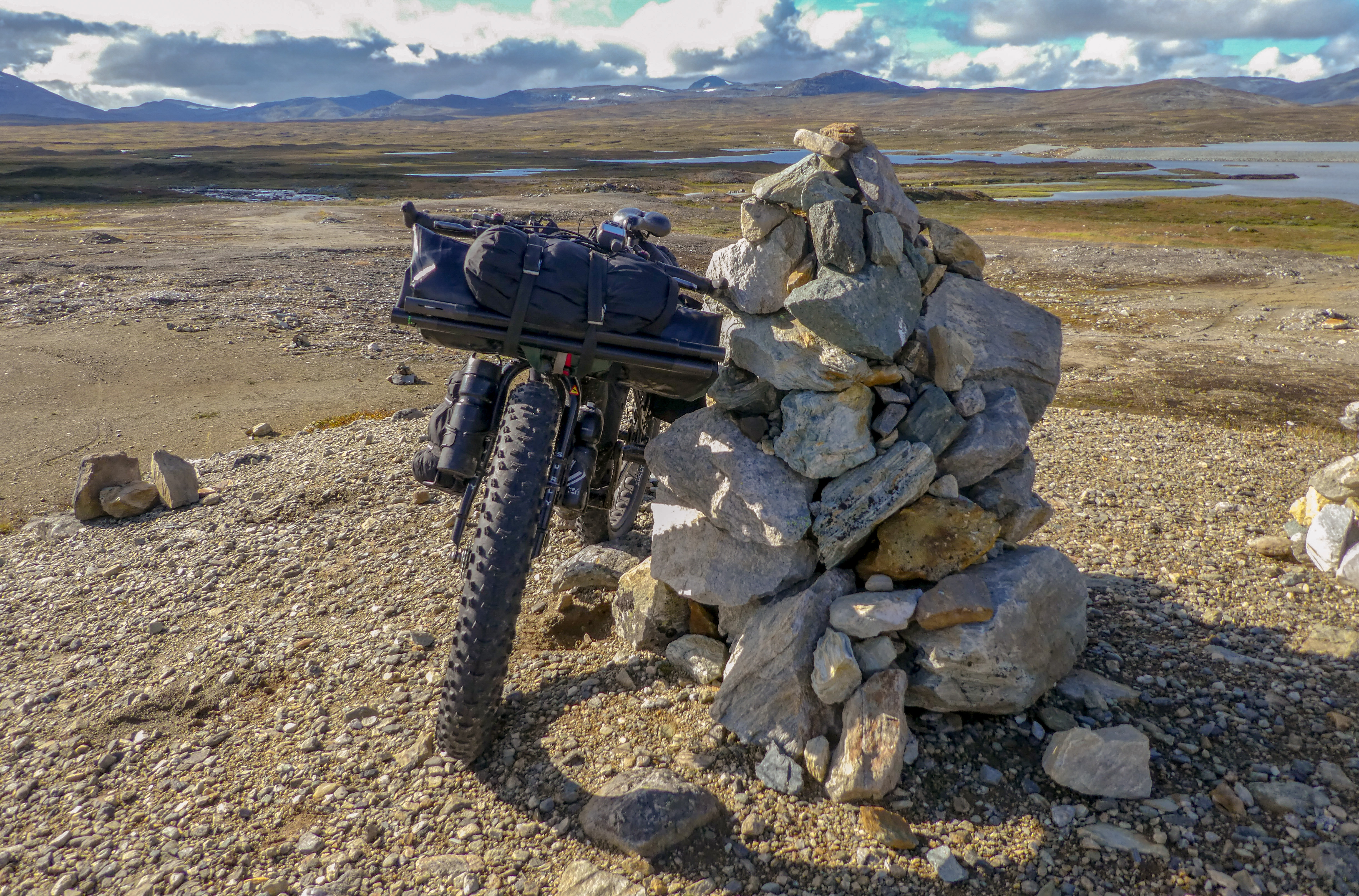 Hier bv goed te zien. Dit was op een circa 7 weken tocht, de packraft en de peddel zitten aan het stuur (samen met nog meer zooi) en ik had vaak voor circa een kleine week voedsel bij me. Als je deze bikepacking-setup hetzelfde vindt als twee dikke zijtassen aan een achterdrager, dan is het duidelijk dat je niet weet waar je het over hebt.