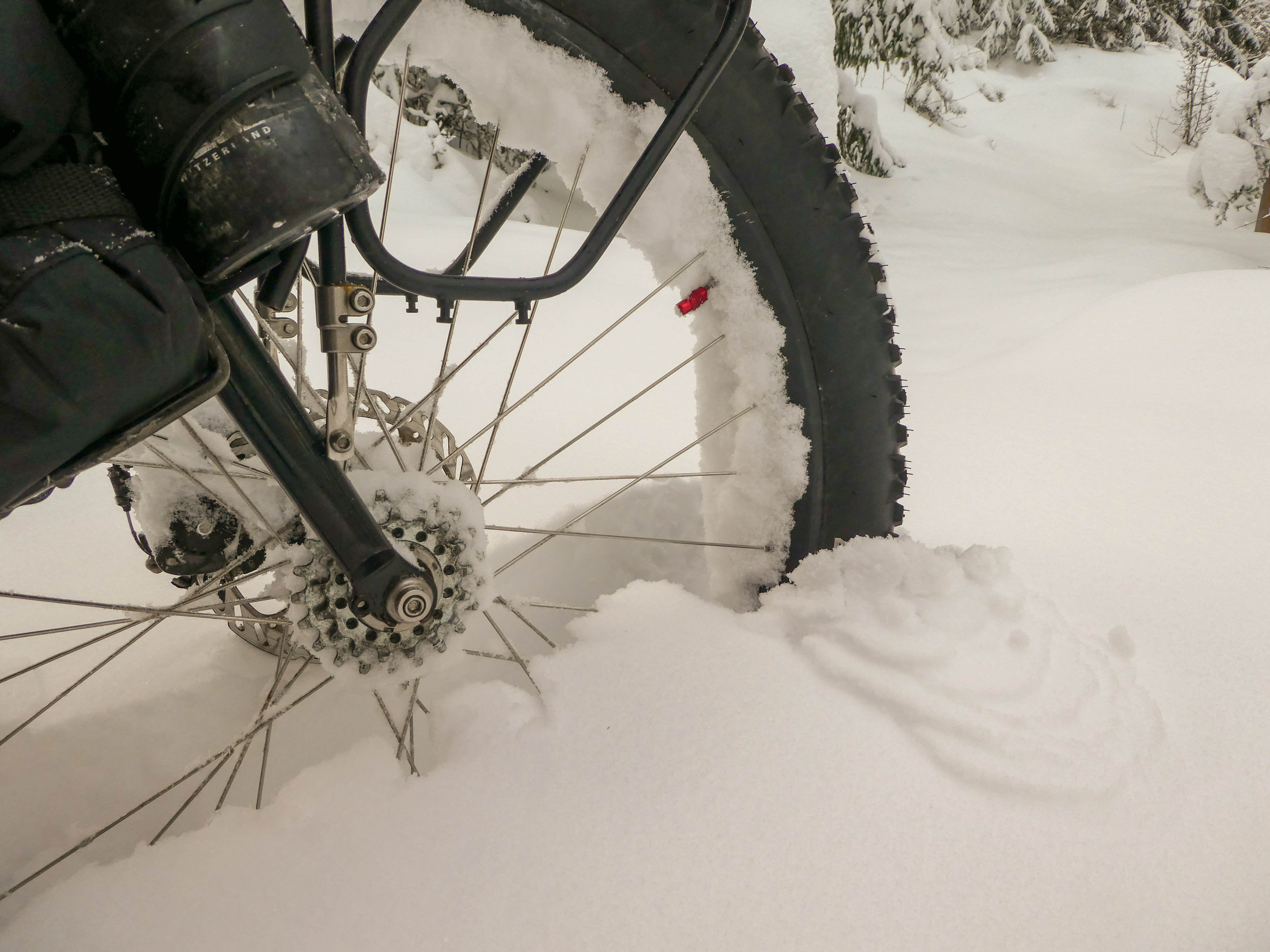 Wat betreft voedsel. Al het eten (behalve vers, zacht voedsel want dat gaat in een kleine rugzak) gaat gewoon in de bikepacktassen. De zadeltas is het zwaarst want daar bovenop ligt ook altijd 't tentje en soms ook nog 't zwemvestje, de vierdelige peddel, een extra fles water etc. Heb nooit last dat de zware tas het balans sterk verstoort en ook geen last van controle verlies bij bagage aan de voorvork (zoals Marco heeft), maar ik heb dan ook een fatbike. Die rollen met hun >10cm bandjes onvermoeibaar door en zijn erg moeilijk uit balans te brengen.