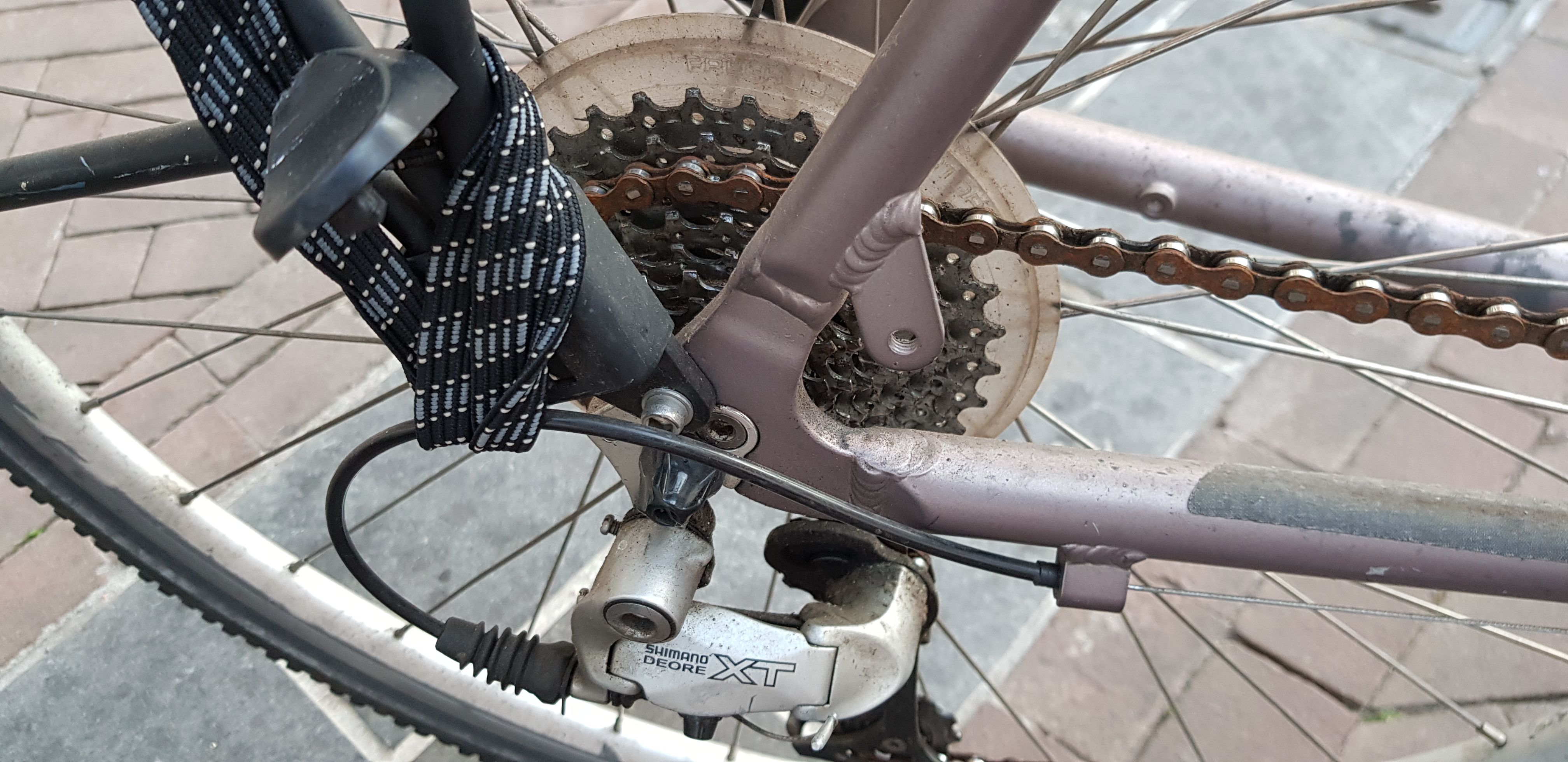 Snelbinder is ingekort, ongetwijfeld omdat de rek er gedeeltelijk uit was (herkenbaar). Wel ludiek zoals die snelbinder vervolgens de kabel van de achterderailleur in bedwang lijkt te houden!.