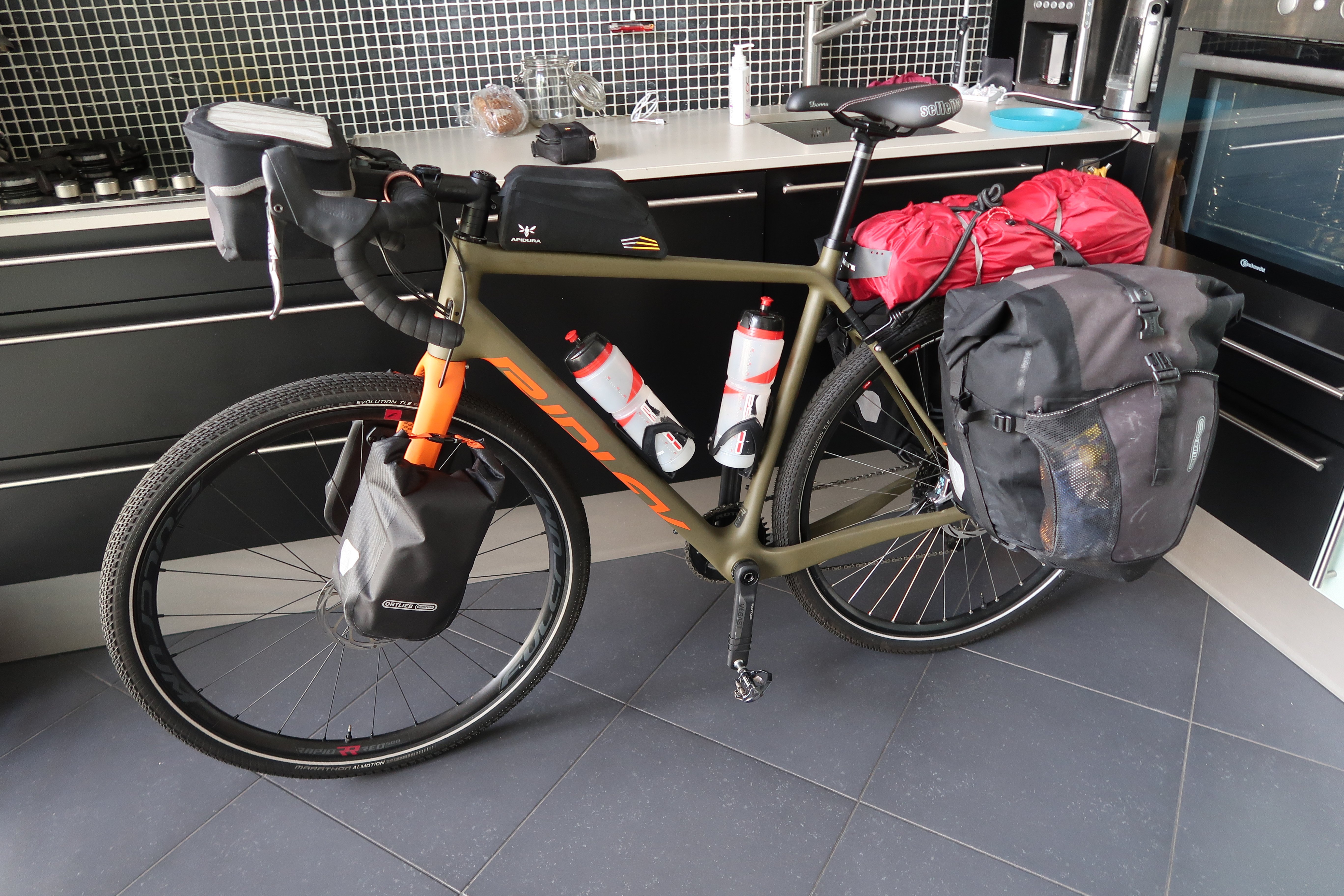 De wielbasis van het frame is wel problematisch voor mensen met grote voeten. Aan de achterkant kun je de tassen nog wel goed zetten, maar zodra je een 50mm band op het voorwiel zet, zit je met de punten van je voeten tegen de band wanneer je een krappe bocht maakt. Een spatbord voor is dus niet mogelijk.