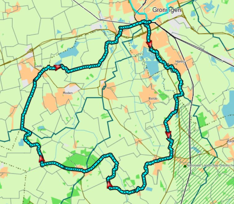 Daarna was de tocht niet echt meer gepland, maar bleken we na afloop volgens mijn fietsapp toch een heel aardig rondje gefietst te hebben. Dat ging via Peest, Norg, Een en over lange bomenlanen naar Leek. Daar hielden we een fijne boterhammenstop op wat kunstige betonblokken. Ouderwets langs de vaart over de steile brug om al slingerend door het Leekstermeergebied uit te komen in Roderwolde, waarna we al meanderend door de Onlanden weer in de bewoonde wereld kwamen (Hotel Van der Valk) en we uiteindelijk via de Peizerweg de stad weer naderden. Klokslag 3 uur en dik 73 km later fietsten we ons rondje om het Peerd en was het tochtje weer gedaan.