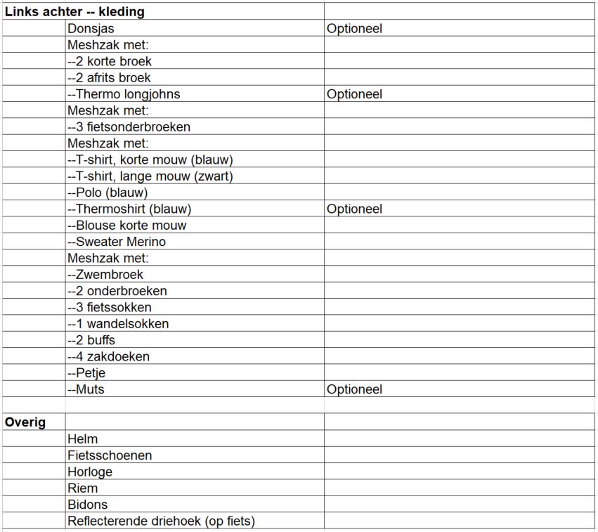 Hierbij mijn lijstje, over een week vertrek ik voor het eerst 2 weken op fiets vakantie (Tsjechie). Voorheen een paar korte tochten in de Benelux gemaakt. Dit jaar heb ik veel van de onderstaande spullen aangekocht (o.a. tent / slaapmat / feedbag / drysacks / kleding).