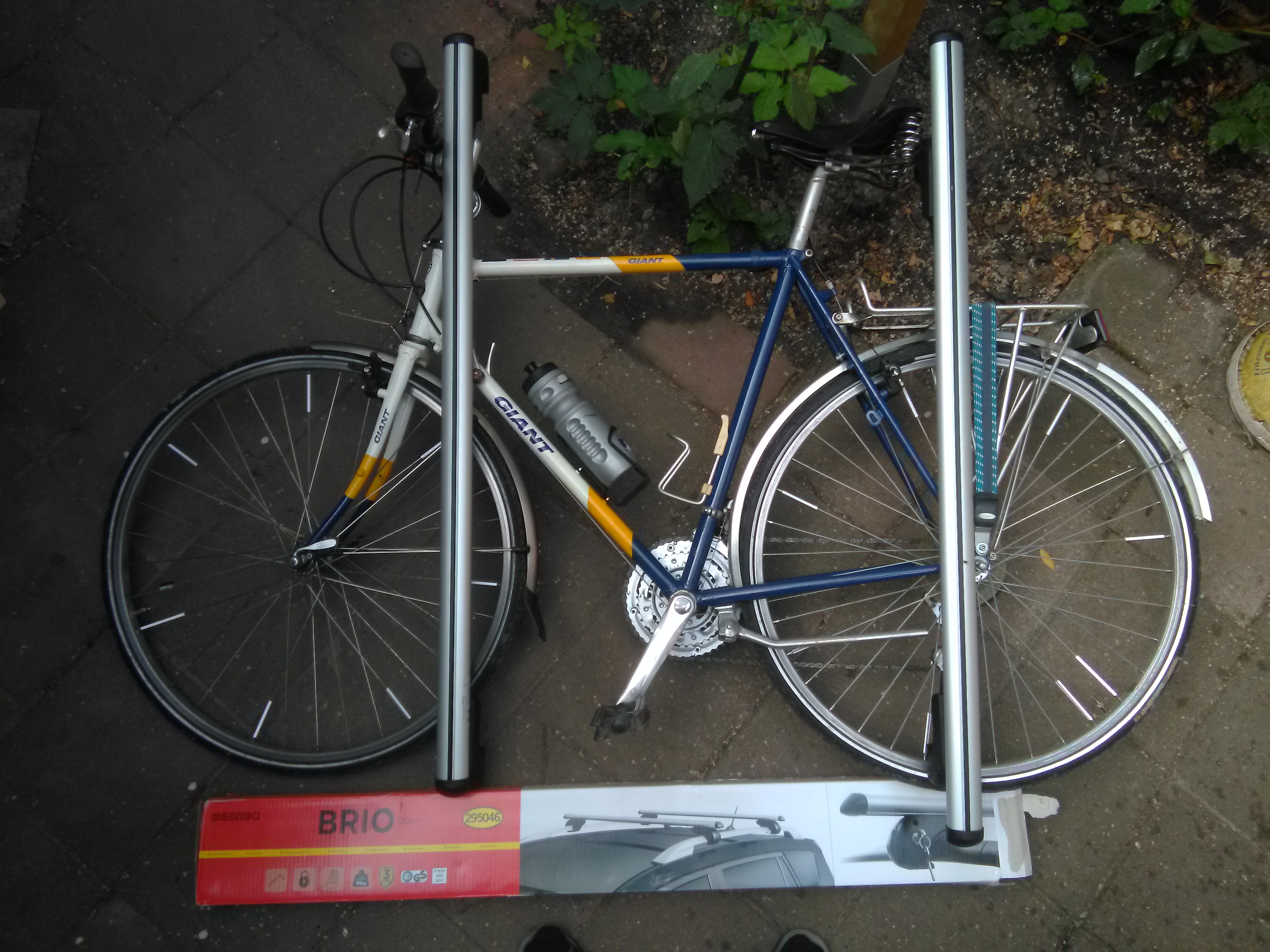 Ik overweeg mijn fiets plat liggend op de dakdragers te monteren, de fiets zelf van stukjes piepschuim voorzien en het geheel met spanbanden vastmaken. De linker crank eraf en het stuur een kwart slag draaien. Ik heb namelijk een veerboot geboekt waarin ik de maten van de auto heb opgegeven: max. 6 m lang en max. 2 m hoog. De foto hieronder betreft een proefopstelling. Afstand tussen de dakdragers gemeten: 69½ cm.