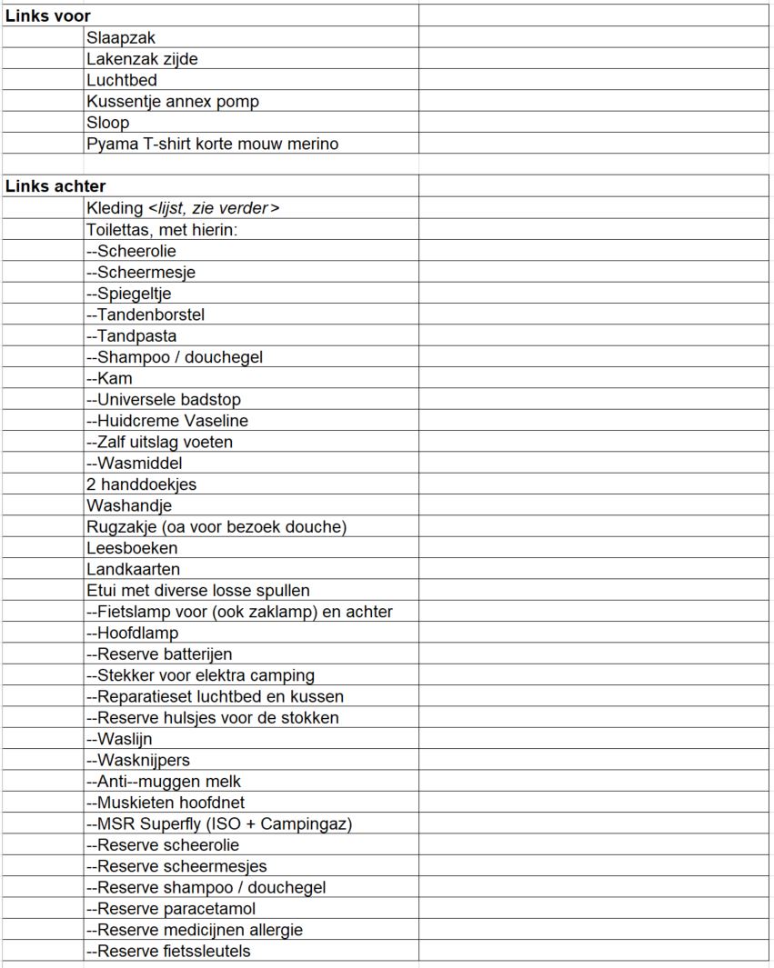 Hierbij mijn lijstje, over een week vertrek ik voor het eerst 2 weken op fiets vakantie (Tsjechie). Voorheen een paar korte tochten in de Benelux gemaakt. Dit jaar heb ik veel van de onderstaande spullen aangekocht (o.a. tent / slaapmat / feedbag / drysacks / kleding).