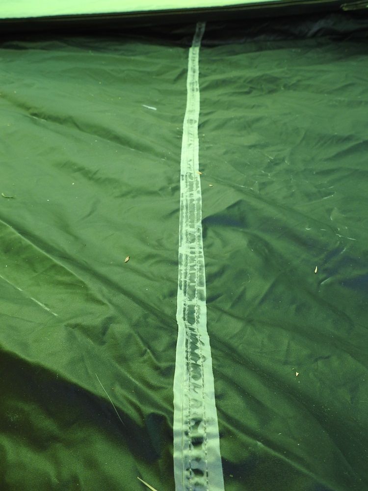 Het lijkt erop dat de tape van het grondzeil van de tent aan het loslaten is (randen van de tap op alle naden zijn "wit" geworden). De tent is pas 2 jaar geleden gekocht (bij een zaak die daarna gestopt is overigens