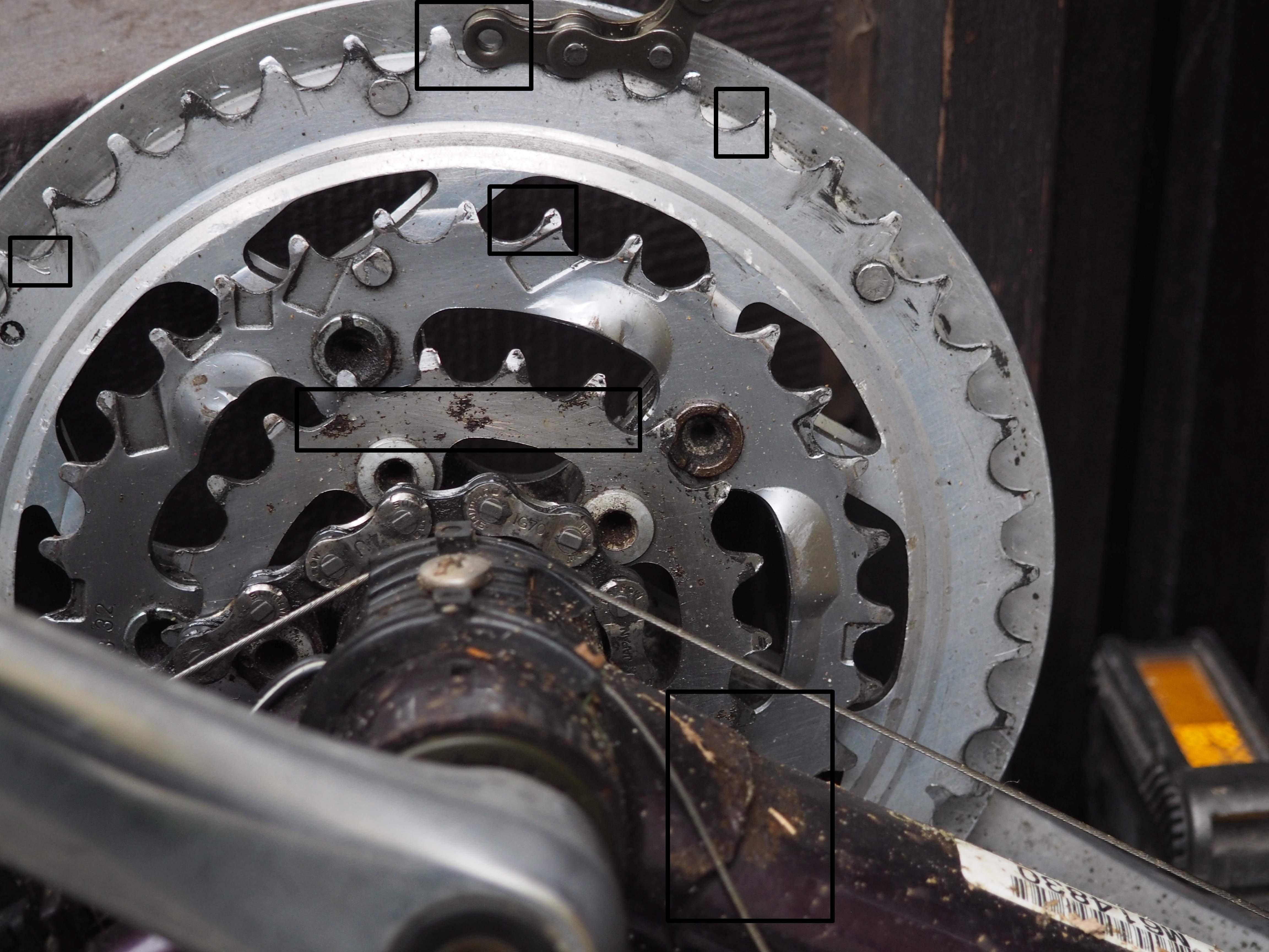 Naast het uitslijten in het algemeen is er sleet die ik online niet terugvond: Op vooral middelste en kleinste kettingbladen lijkt het alsof de rollers het metaal van de tanden naar buiten heeft geperst: hoe komt dit en is dit bij te vijlen? Er is ook een puntje van de tanden 'ingesneden' + "schaafwonden" (is dit door slechte afstelling+zwaar trappen?) en/of roest op het blad zelf (NB ook roest op frame op foto). Is al zulke schade (ab)normaal, is dit reden tot vervanging?