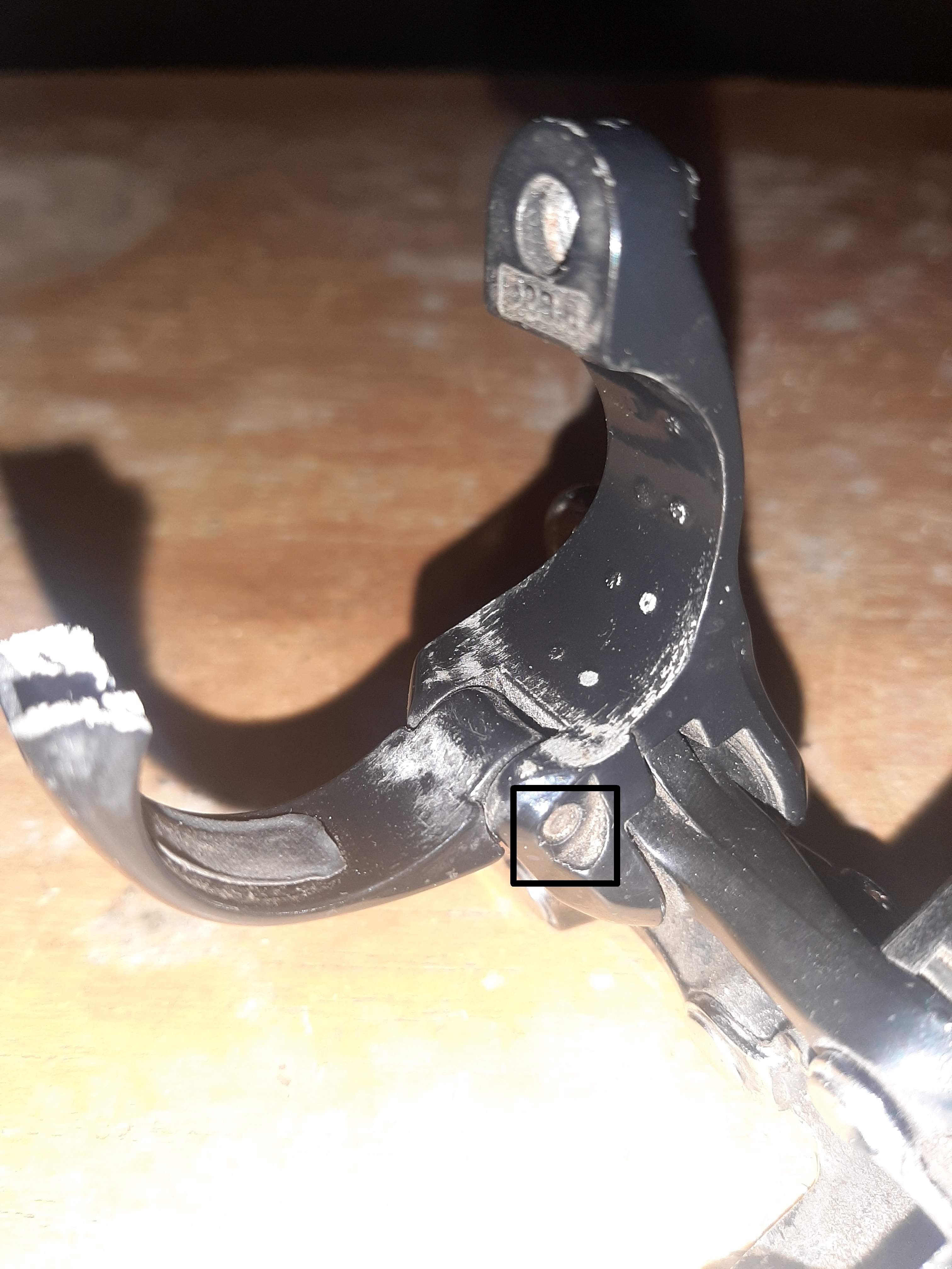 Detail van hoe de beugel vastzit in de derailleur (geen vijsje of boutje of wat ook aan de andere kant; daarom dat ik denk dat het total loss is):