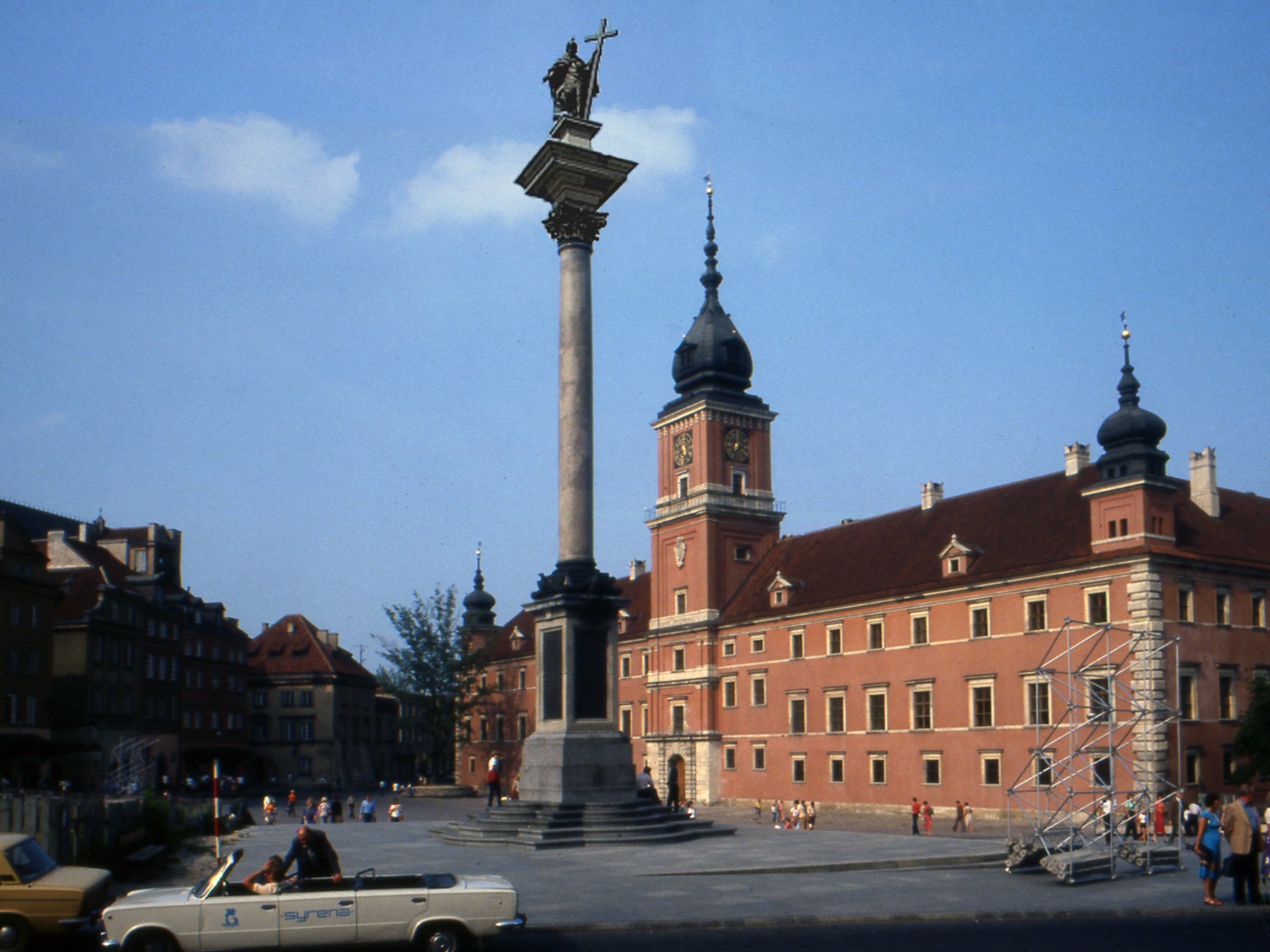 Eenvoudig dat beeld op Google gezocht en goed opgelet op dezelfde lichtval, dan gekopieerd en hier geplakt. Dit is het oude koninklijke paleis van Warschau, de Zamek Królewski met de zuil van koning Zygmunt. Na de tweede wereldoorlog was Warschau niets meer dan een woestenij van puinhopen en het oude centrum is nadien in oude stijl herbouwd. Het paleis kwam in 1974 gereed. Ik sprak daar enkele mensen die getuige waren hoe de zuil en het paleis door de Duitse bezetters werden opgeblazen. Wat een boeven.