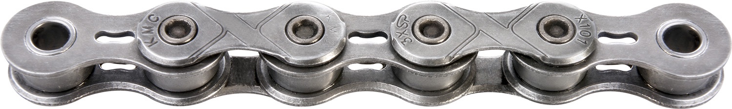Het is me gelukt om een ketting stuk te trappen. Op onze Santos Doubletravel tandem is de synchronisatie ketting (voor) gebroken. Zo’n goudkleurige KMC X9. Ongeveer 3000 Km mee gereden, en nog lang niet versleten. Precies op een schalm naast het pennetje gebroken. Oorzaak is waarschijnlijk omdat de tandwielen erg klein zijn, 32 tands . Als ik er met 70 kilo op sta komt er een 3 keer zo grote kracht op de ketting te staan. (Kracht x arm). Omdat ik het niet meer vertrouwde en de tandwielen er nog heel goed bij staan heb ik een nieuwe ketting besteld. Achter is een Rohloff aan het werk met dezelfde type ketting, ook hier tandwielen in zeer goede conditie. Bij KMC is de beroemde X1 ketting opgevolgd door de e1, deze is smal, 3/32 inch. Op de site staat ook een iets breder type ketting, de e101 (1/8 inch).