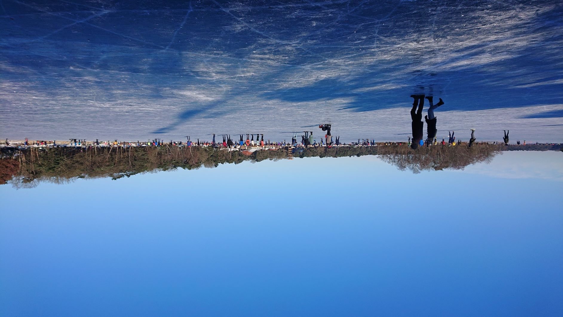 Ik zie spiegelglad ijs met in de lucht zwevende schaatsers...