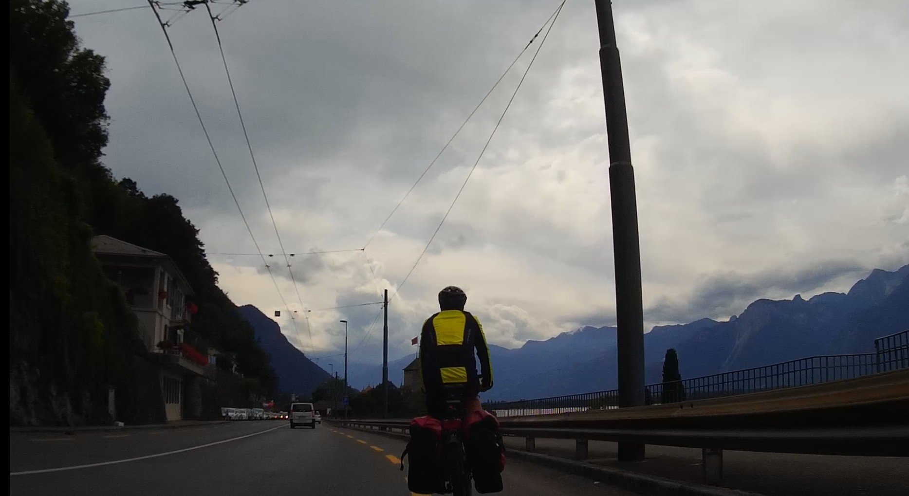 Dank je wel, de contouren van het kasteel komen me meteen bekend voor, ondanks dat de Zwitserse vlag geblurd is.... Best eng om te zien dat die fietser midden op de gele lijn reed, zo dichtbij de auto's....