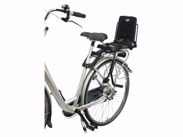 Momenteel zit ze op een Bobike Junior (max 35 kg) die bevestigd is op mijn stalen frame en rust op een stalen Steco bagagedrager (ook max 35 kg). Daardoor is de constructie eigenlijk dubbel zo sterk.
