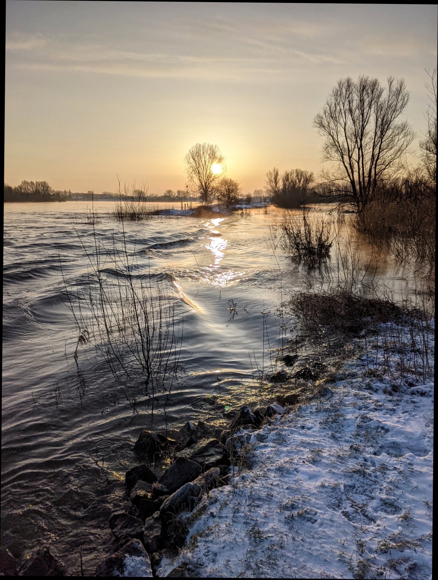 Niet echt een mooiste foto (te rommelig en te veel Bob Ross), maar om toch iets te plaatsen een kiekje van enkele weken geleden bij ons aan de Maas, toen het water heel hoog stond en het 10 graden vroor.