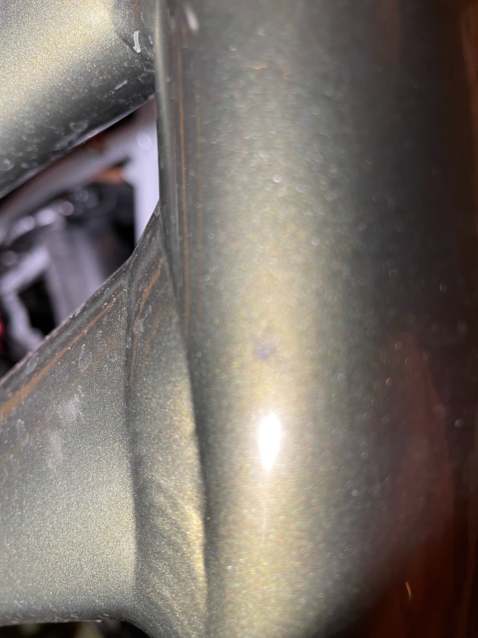 Ik heb contact gehad met Koga hierover, maar die sturen me naar de dealer waar de fiets gekocht is ter beoordeling. Ik had gehoopt dat ik zo een lakstift / spuitbusje met de juiste kleur (Pine Green Shiny dus niet zomaar verkrijgbaar) zou kunnen regelen (desnoods betaald) maar die vlieger gaat dus ff niet op.