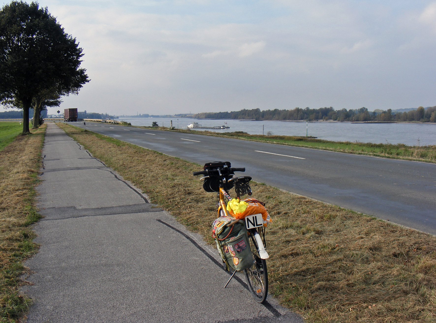 Inderdaad Oraniendeich, je hebt het goed. Ik had de hangbrug van Emmerich overgefietst en dan meteen rechtsaf, daar is het. Maar op Google satelliet zie ik rommelige graafwerkzaamheden. De bomen langs de dijk gekapt. :( De foto is van 13 oktober 2017. Wat een heerlijk warm weer had ik daar. Op weg naar de Jugendherberge van Kleve (Kleef), zie foto. Man, wat een steile klim om dáár te komen....