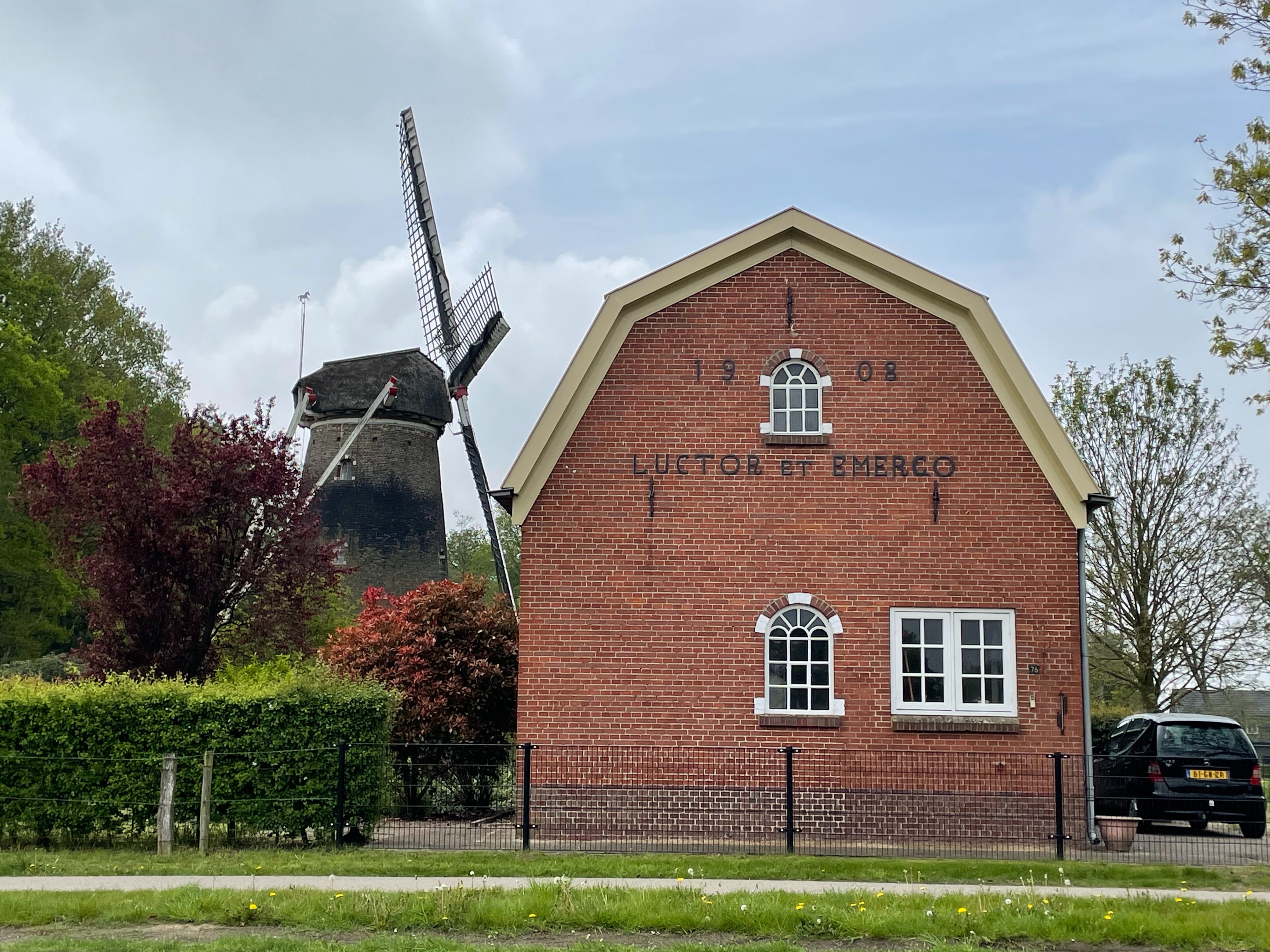 Er is slechts één molen met de naam Luctor et Emergo en die staat in het Brabantse Rijkevoort. Maar de wieken zijn daar uitgerust met het Van Bussel-systeem, zeg maar zoiets als de voorkant van een vliegtuigvleugel. Op streetview komt dat huis niet voor. En de windwijzer op de kap, nét achter het dak verstopt, toont een paard. Het wordt toch een hele gezoek en ik ga nu naar bed....