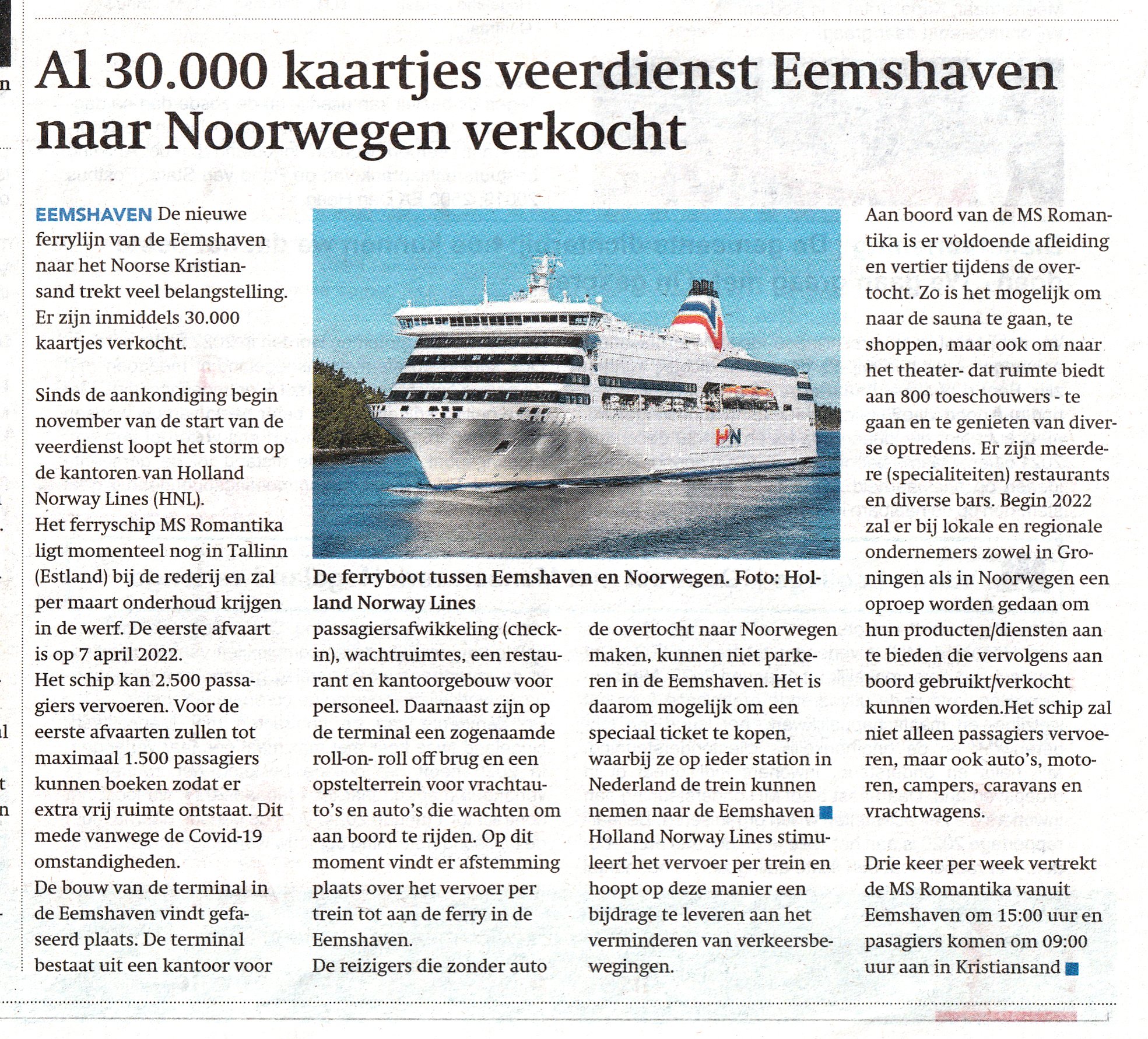 Eemshaven krijgt vaste veerverbinding met Noorwegen
