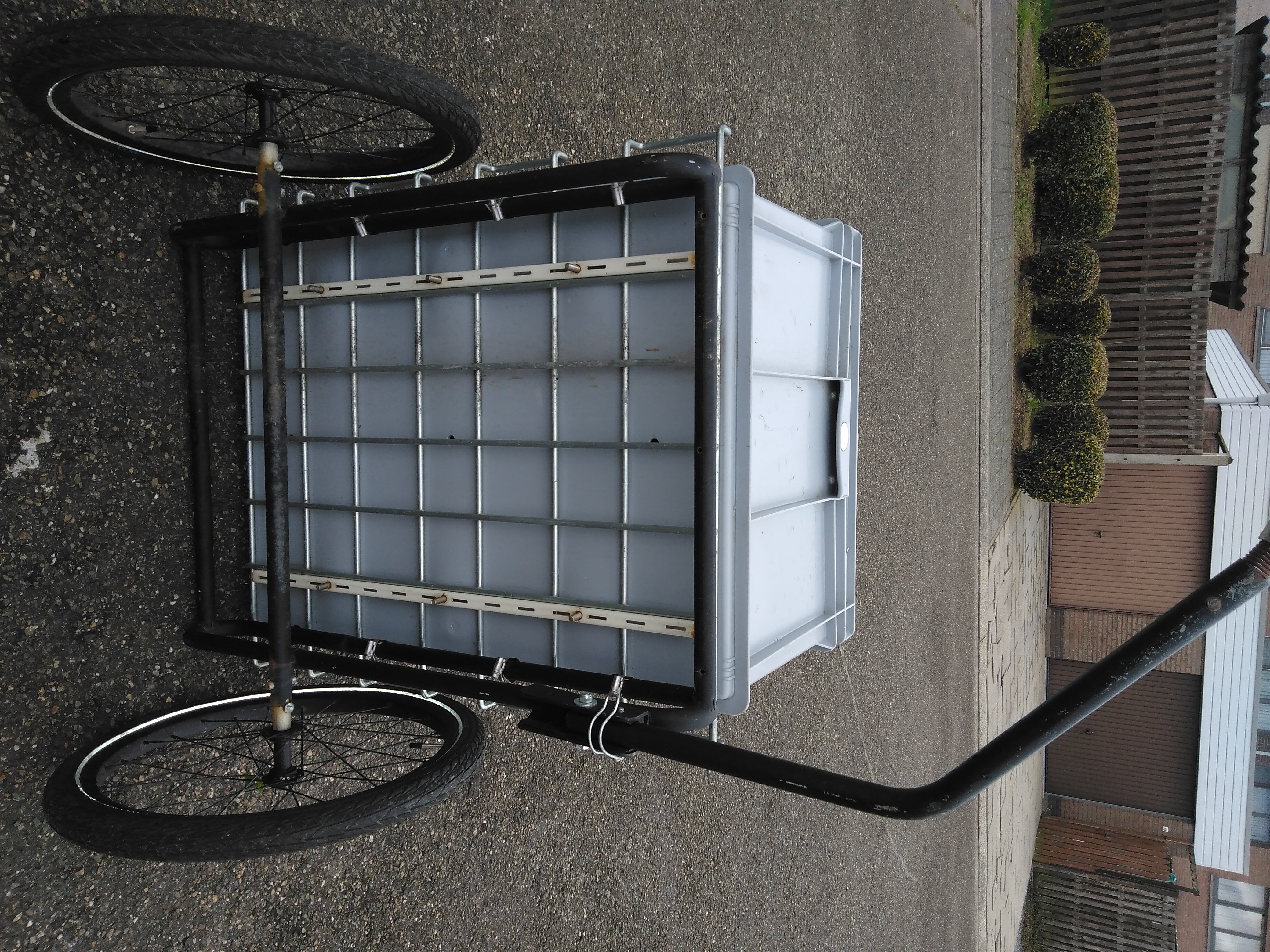 Ik vond mijn gewenste boodschappenkar ook niet in de fietshandel, daarom het frame van een oudere hondenkar gebruikt en daarop een plastick bak gemonteerd. Simpel en erg doeltreffend. Eens bij de supermarkt aangekomen neem je toch een winkelkar van de winkel zelf. Ik kan nu veilig mijn boodschappen vervoeren. Het enige minpunt is dat de snelsluiting niet straf genoeg is en ik bij regelmaat de bevestigings koppeling voor de kar moet controleren en weer terug wat in een hogere positie zetten. Mijn kar staat winter en zomer buiten.