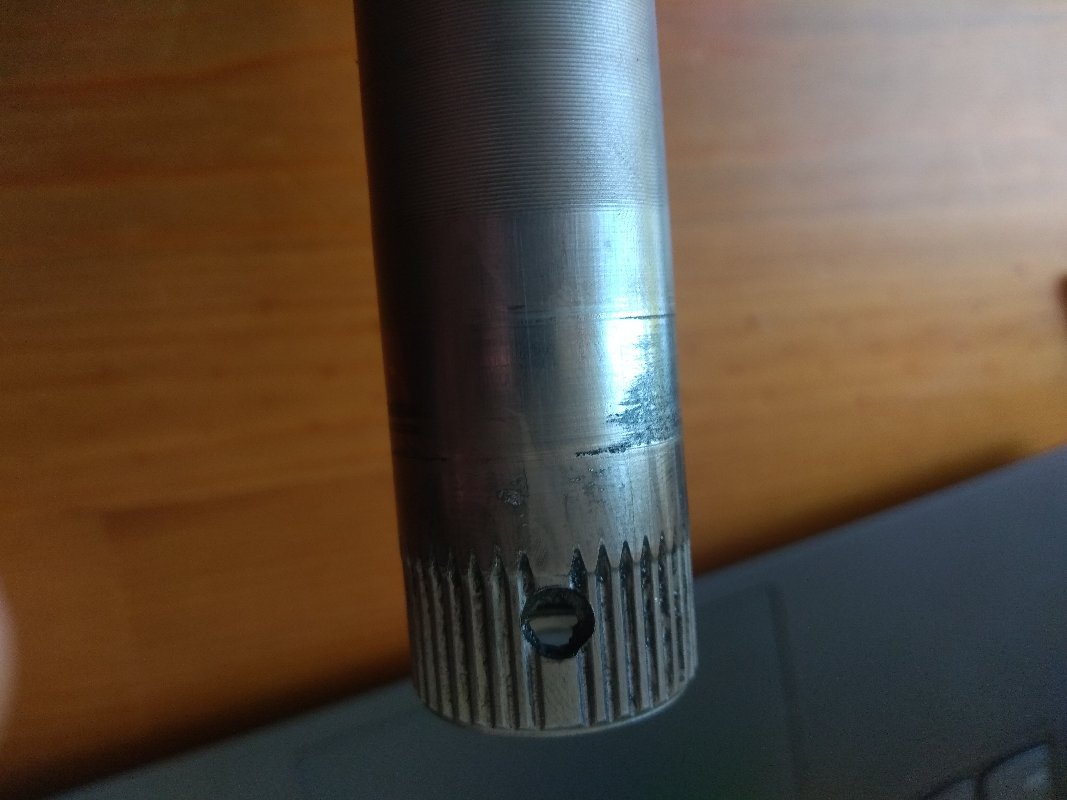 Goede tip van de slijtage van de as. Ik heb het meteen even bekeken. Zie foto. Ja, als ik er met mijn nagel overga is er een minieme grens waar de nagel wel achter blijft haken, en dat is niet uniform over de gehele omtrek.