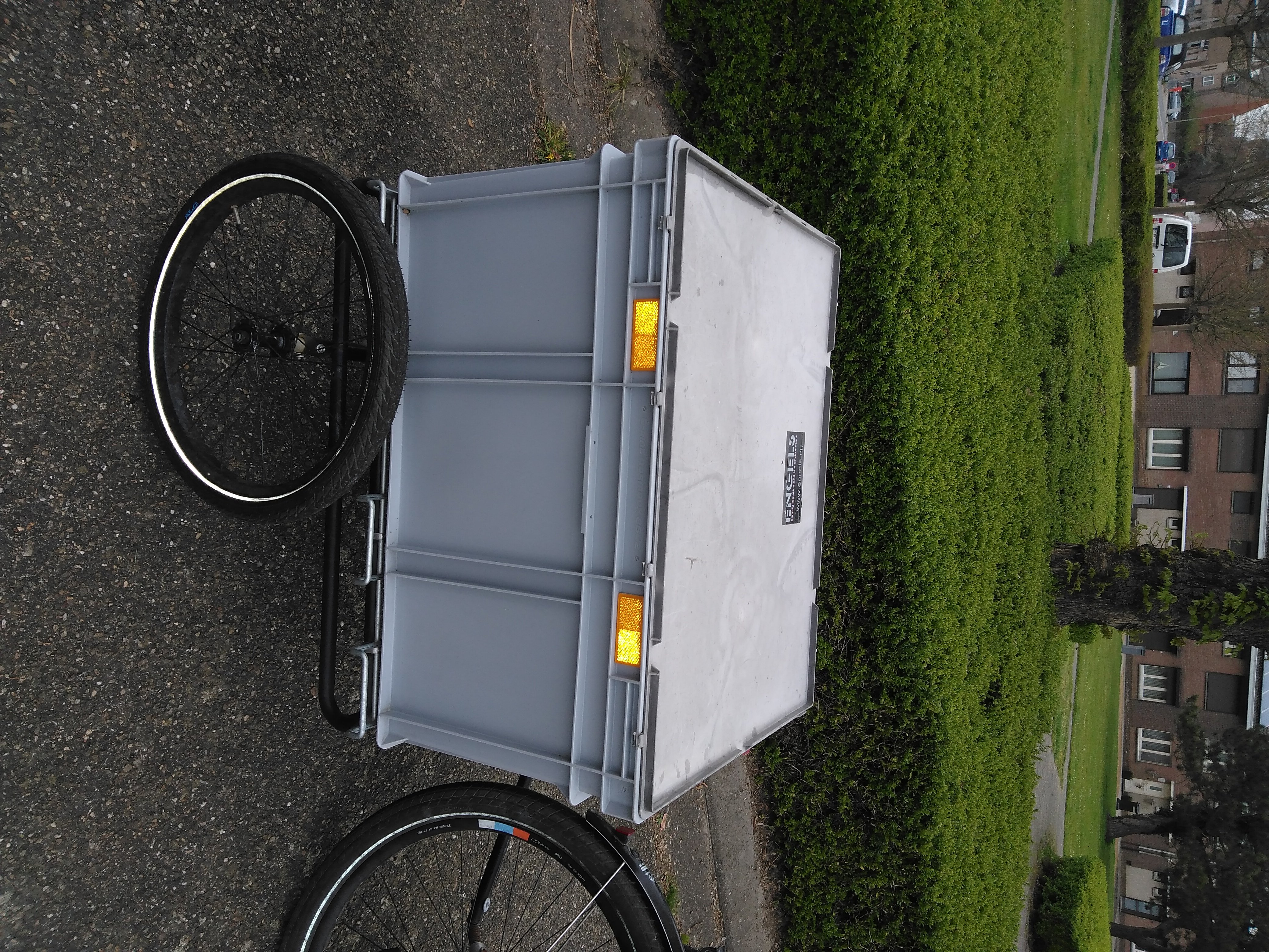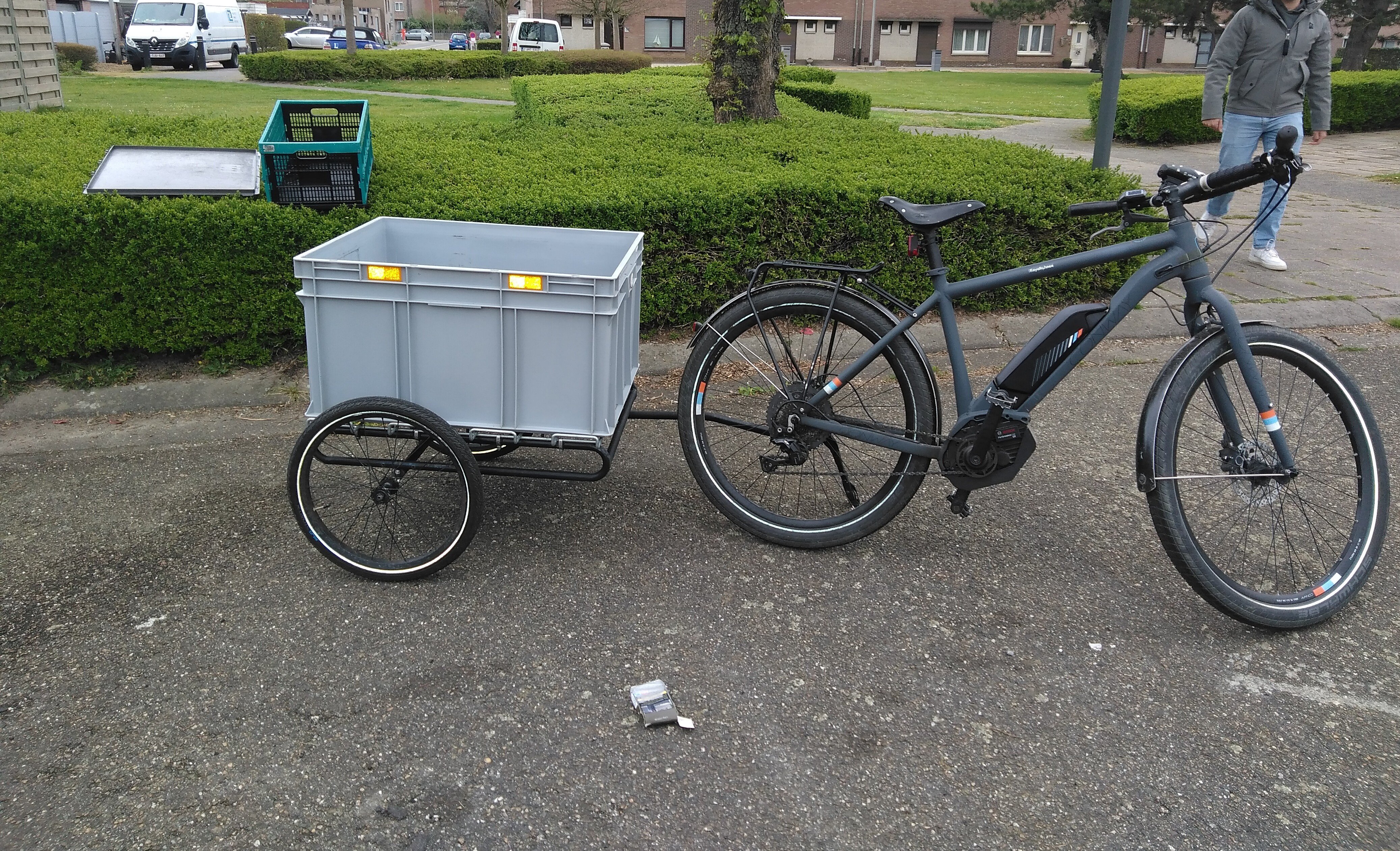 Ik vond mijn gewenste boodschappenkar ook niet in de fietshandel, daarom het frame van een oudere hondenkar gebruikt en daarop een plastick bak gemonteerd. Simpel en erg doeltreffend. Eens bij de supermarkt aangekomen neem je toch een winkelkar van de winkel zelf. Ik kan nu veilig mijn boodschappen vervoeren. Het enige minpunt is dat de snelsluiting niet straf genoeg is en ik bij regelmaat de bevestigings koppeling voor de kar moet controleren en weer terug wat in een hogere positie zetten. Mijn kar staat winter en zomer buiten.