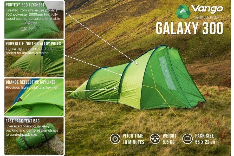 VERKOCHT De Vango Galaxy 300 is een ruime tunneltent voor 3 personen. Je zet de Galaxy gemakkelijk op, want de binnen- en buitentent zitten aan elkaar vast.