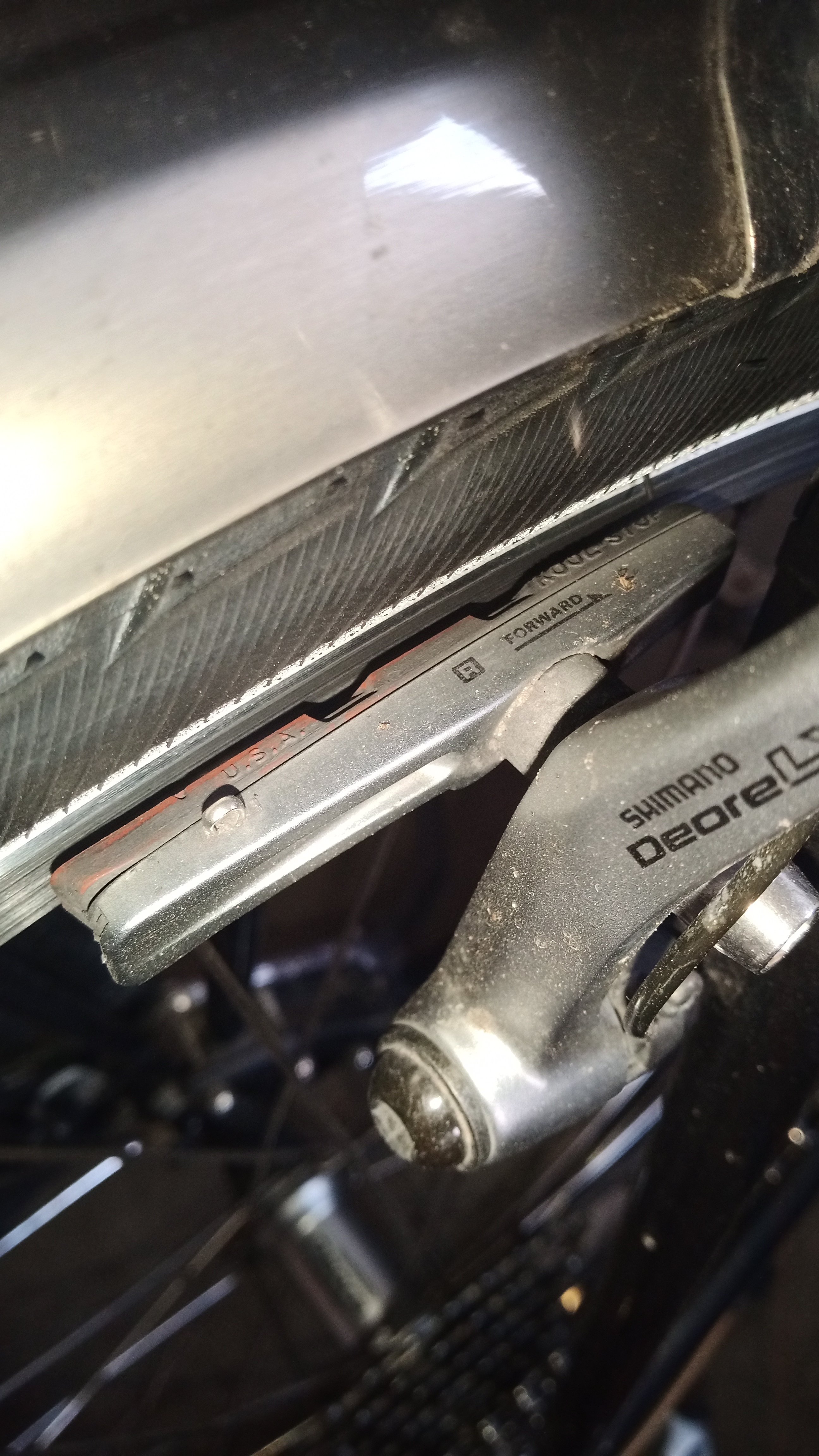 De bovenkant van de T is bekleed met rubber en drukt tegen de velg. En bij de T zit de montage as in het midden. Bij de originele Shimano's zat de as meer naar voren. Maar maakt dat uit?