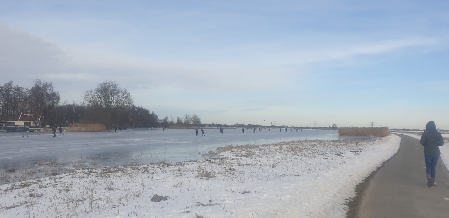 Donderdagmiddag lukte het om alle verplichtingen uit de agenda te gooien, zodat we op zoek konden gaan naar een mooie schaatsstek. Corrie regelde - heel decadent - een deelauto, zodat we ook iets verder van huis konden rondkijken. De eerste schaatsers zagen we op de Wijde Aa bij Hoogmade. Dappere pioniers, waarvan ik hoop dat ze het ijs hier al enkele dagen goed geobserveerd hadden en de zwakke plekken kenden. Op zich zag het ijs er al goed uit, maar wij vonden hier het te stil en te onbekend om er nu al op te gaan.