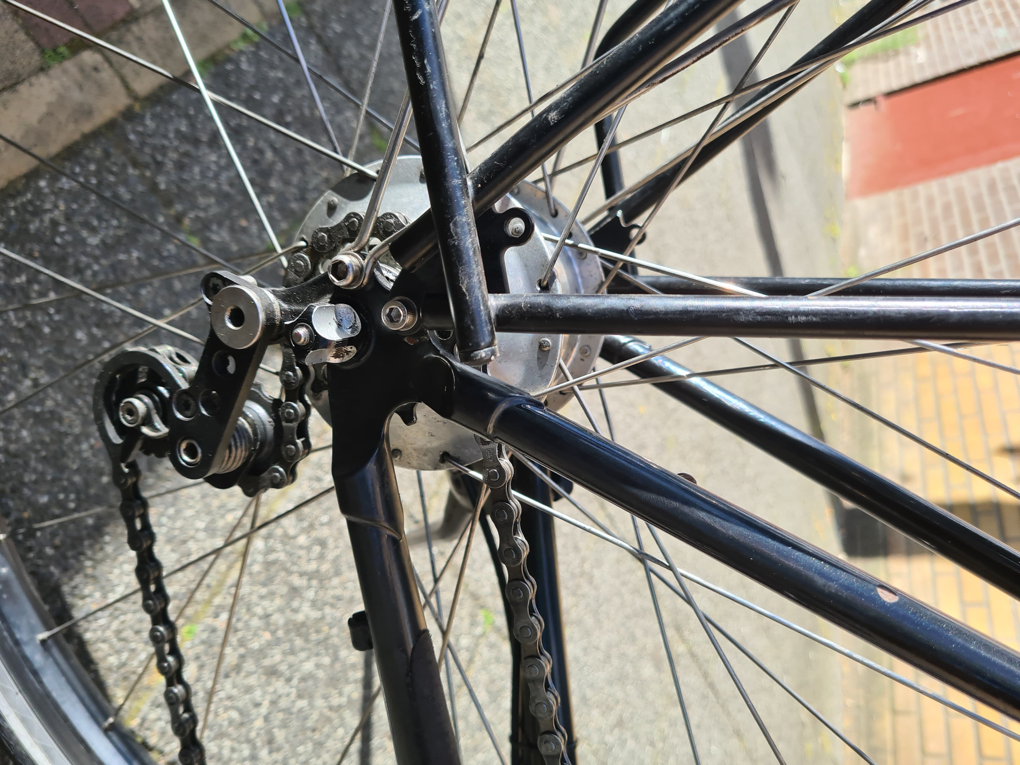 Ik zag vandaag dat er een bout M6x16 ontbrak. De naaf heeft een oem2 asplaat, die in die bout moet passen om tegen druk te geven tijdens het schakelen.