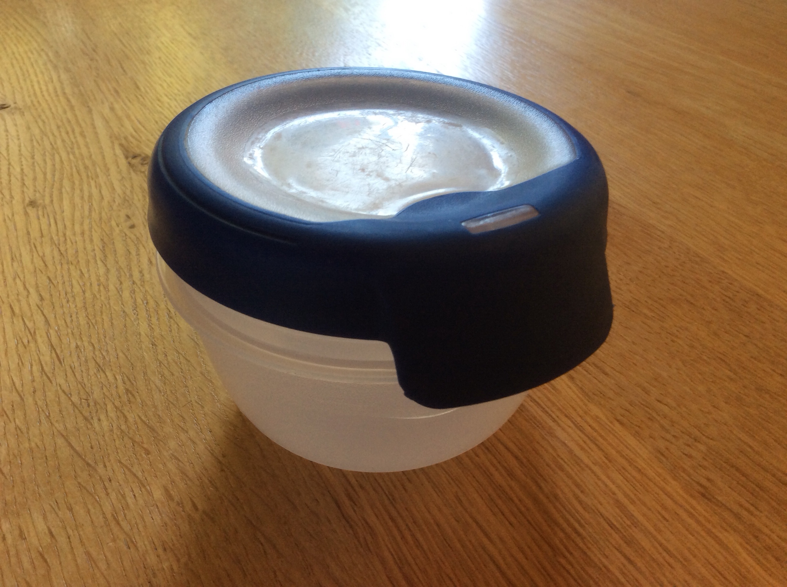 Ik gebruik daarvoor een Nalgene potje, met draaidop. Is nog nooit gaan lekken onderweg, en door zijn vorm (breed en geen versmalde opening) goed schoon te maken.