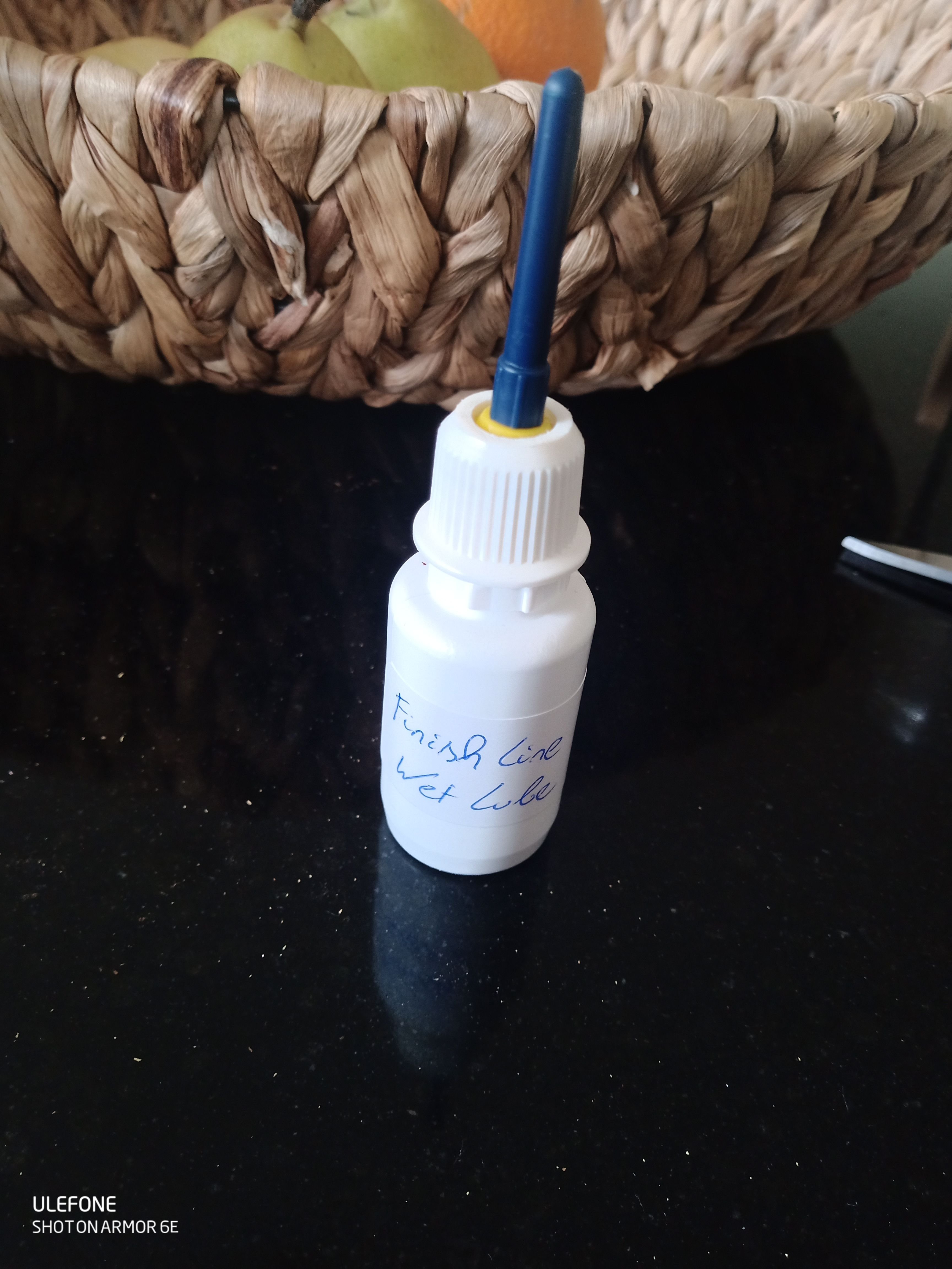 Ik neem altijd een flesje Shimano of Pedros wet lube mee. Die flesjes werken met een schroefdop en gaan niet lekken, opgeborgen in mijn gereedschaptasje.