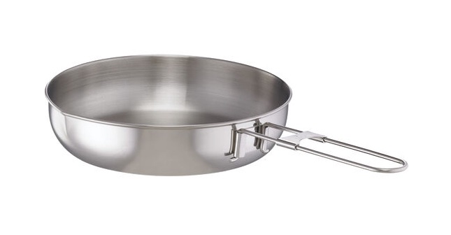 Ik doe nu een jaar of tien met een koekenpan met een doorsnede van ca. 20 cm. Ik gebruik 'm op fietsvakanties maar ook als we met de auto gaan kamperen. Inmiddels is de bodem erg bol geworden. Misschien moet ik maar eens op zoek naar een vervangende pan.