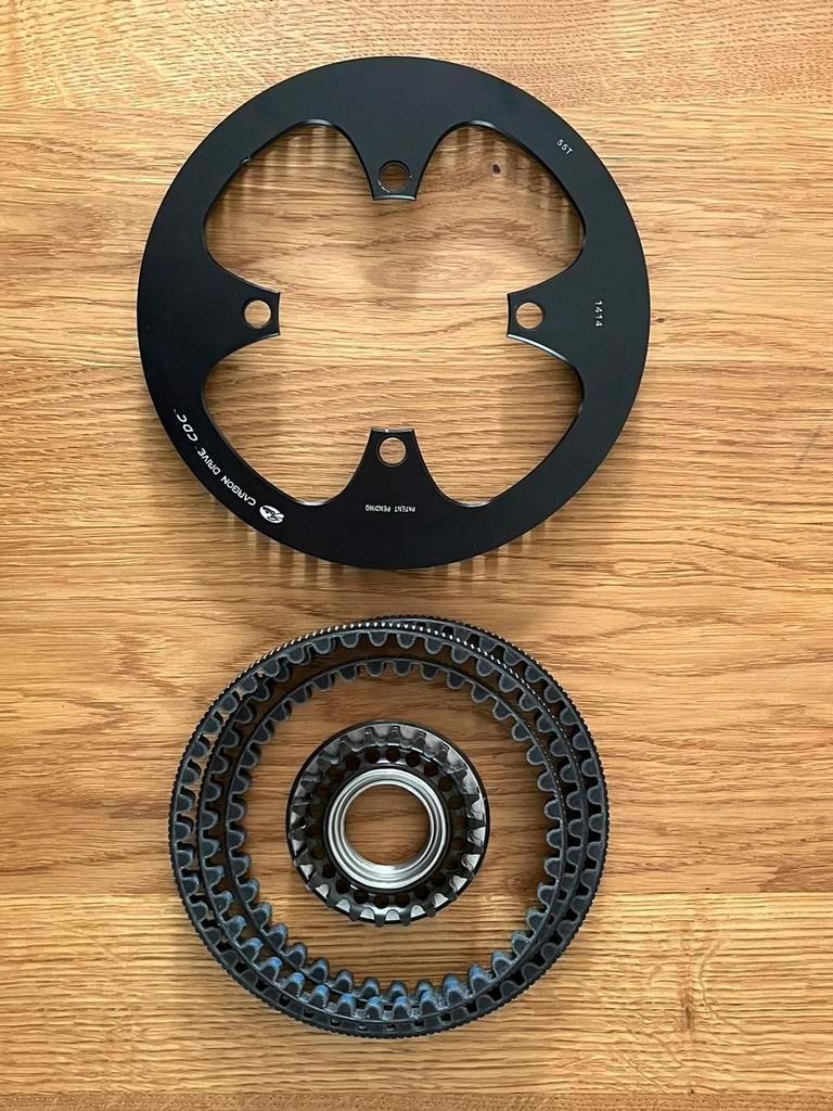 zo goed als nieuwe set Gates Carbon Drive CDC bestaande uit een 55-tands voorblad, 22-tands opschroef tandwiel voor Rohloff en een 125-tands riem. De set komt van een Santos Travel Lite en is een kleine 5.000km gebruikt. Het gaat dus om de CDC serie (zonder ‘tussenschot’ zoals bij de CDX), welke niet meer te krijgen is. De set is te koop omdat er in verband met montage van Pendix (elektrische ondersteuning, andere riemlijn) overgestapt is op CDX.