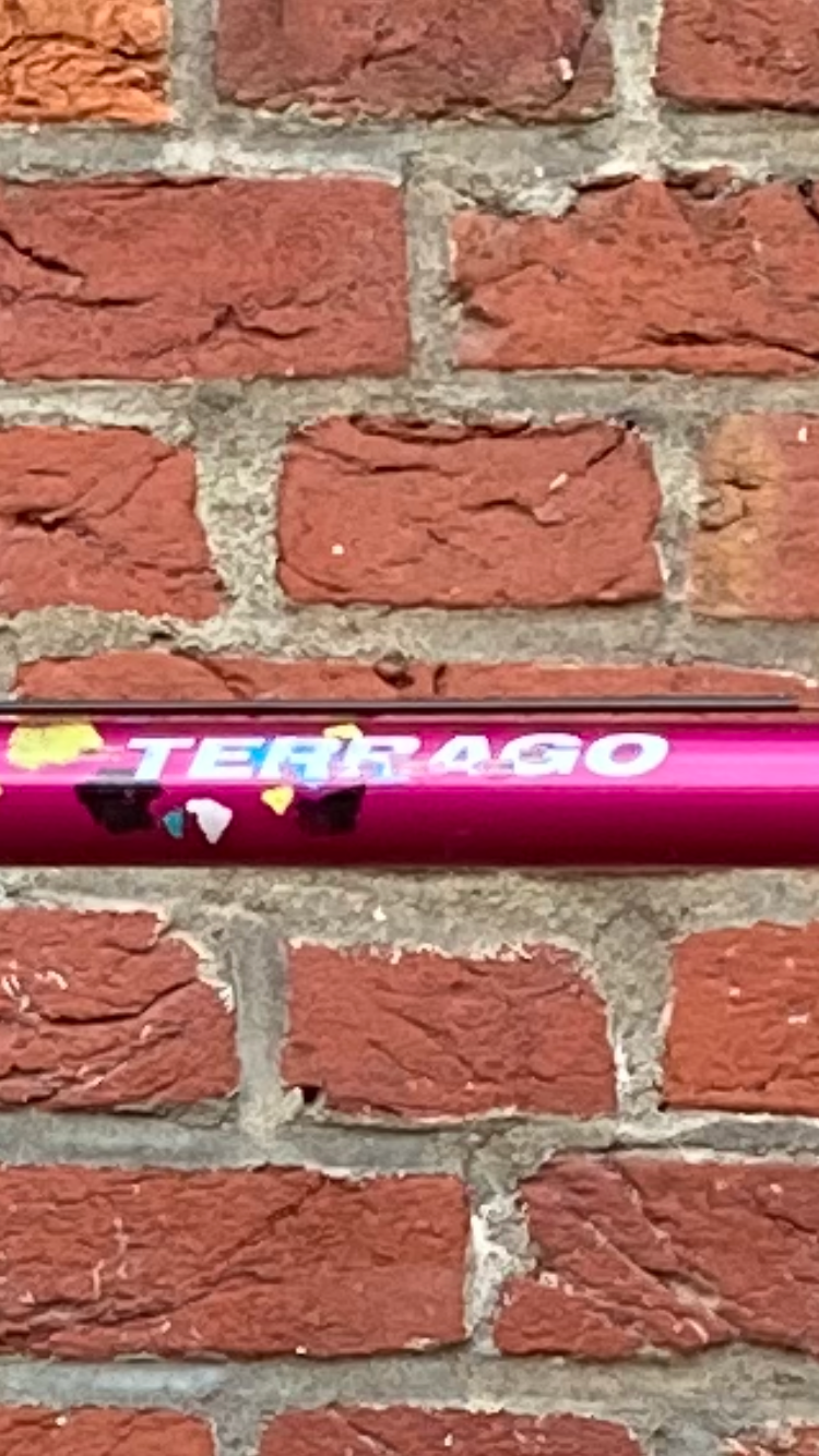 Kenmerkende beschadiging op de bovenbuis (aandrijfkant) door de letters ‘Terrago’ heen Beschadiging zit enigszins op een rij en nagenoeg door de lak heen, waarbij geringe roestvorming zichtbaar is.