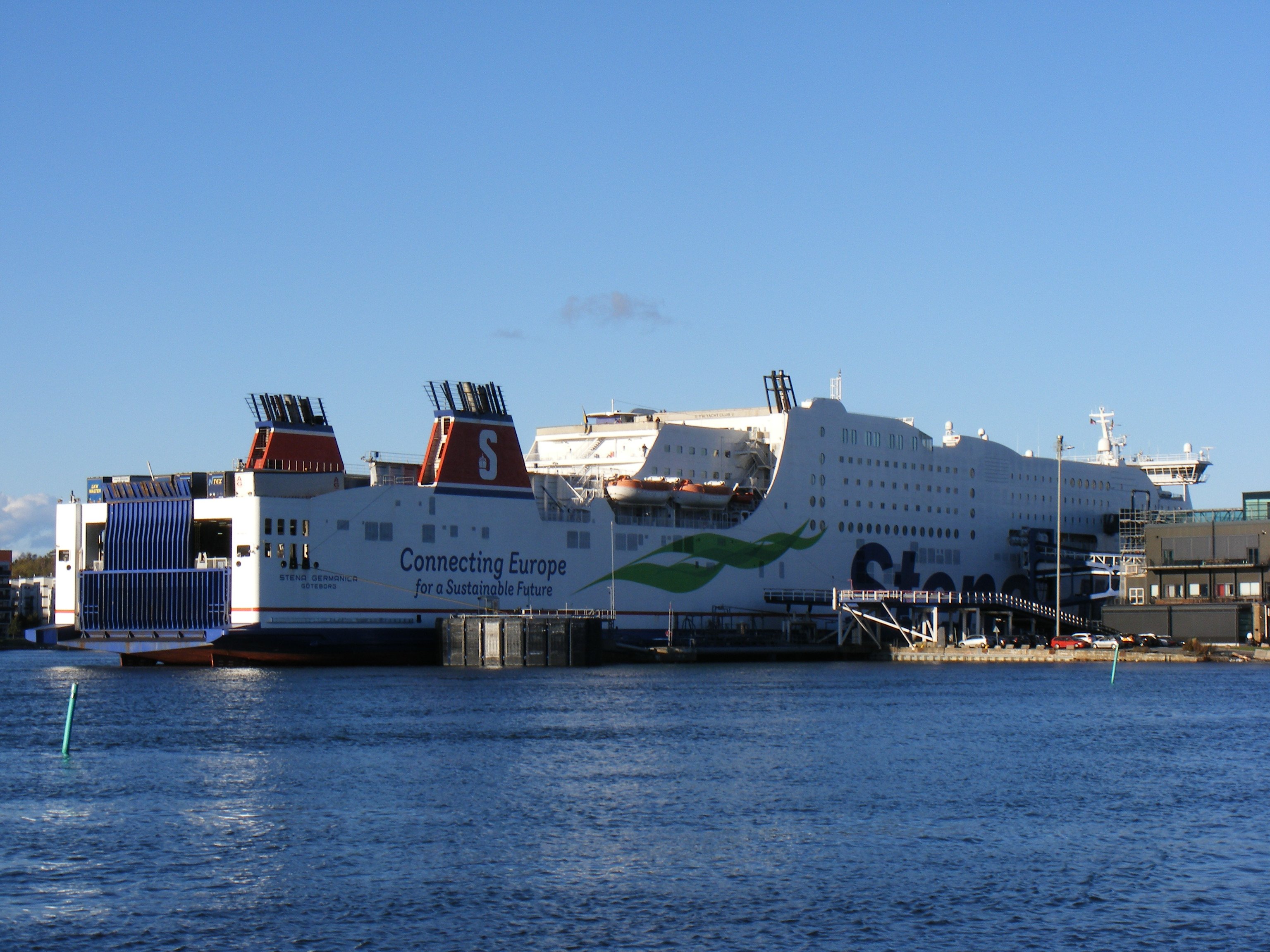 De beide schepen van Stena Line varen alleen op deze lijn met methanol als brandstof. Dit is de herkennen aan de groene golven op de romp van het schip, zie foto (in Göteborg, september 2018).