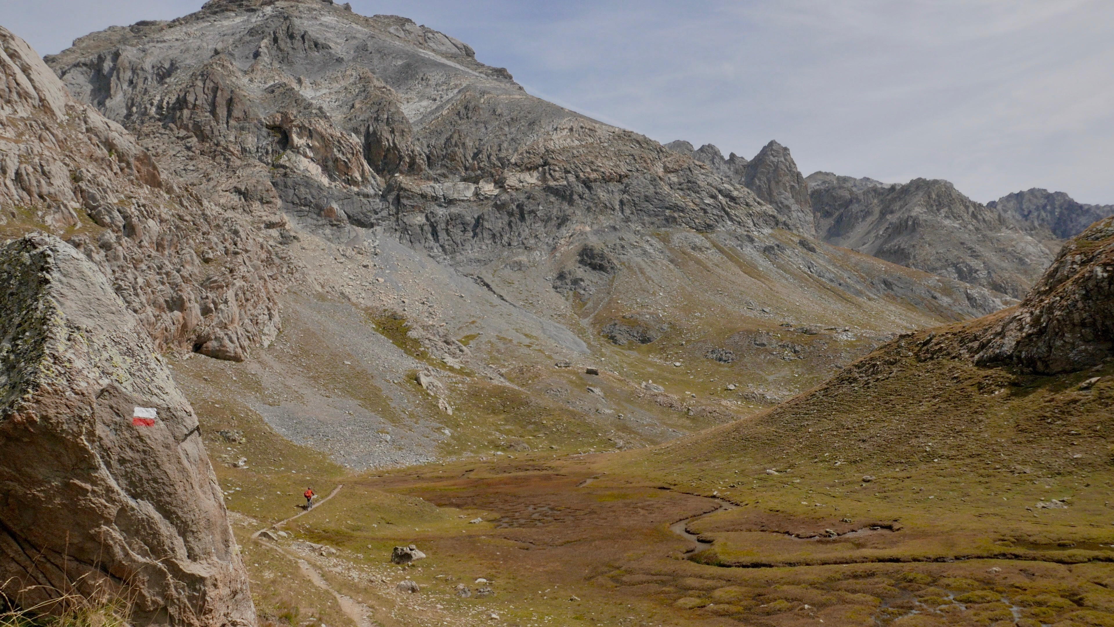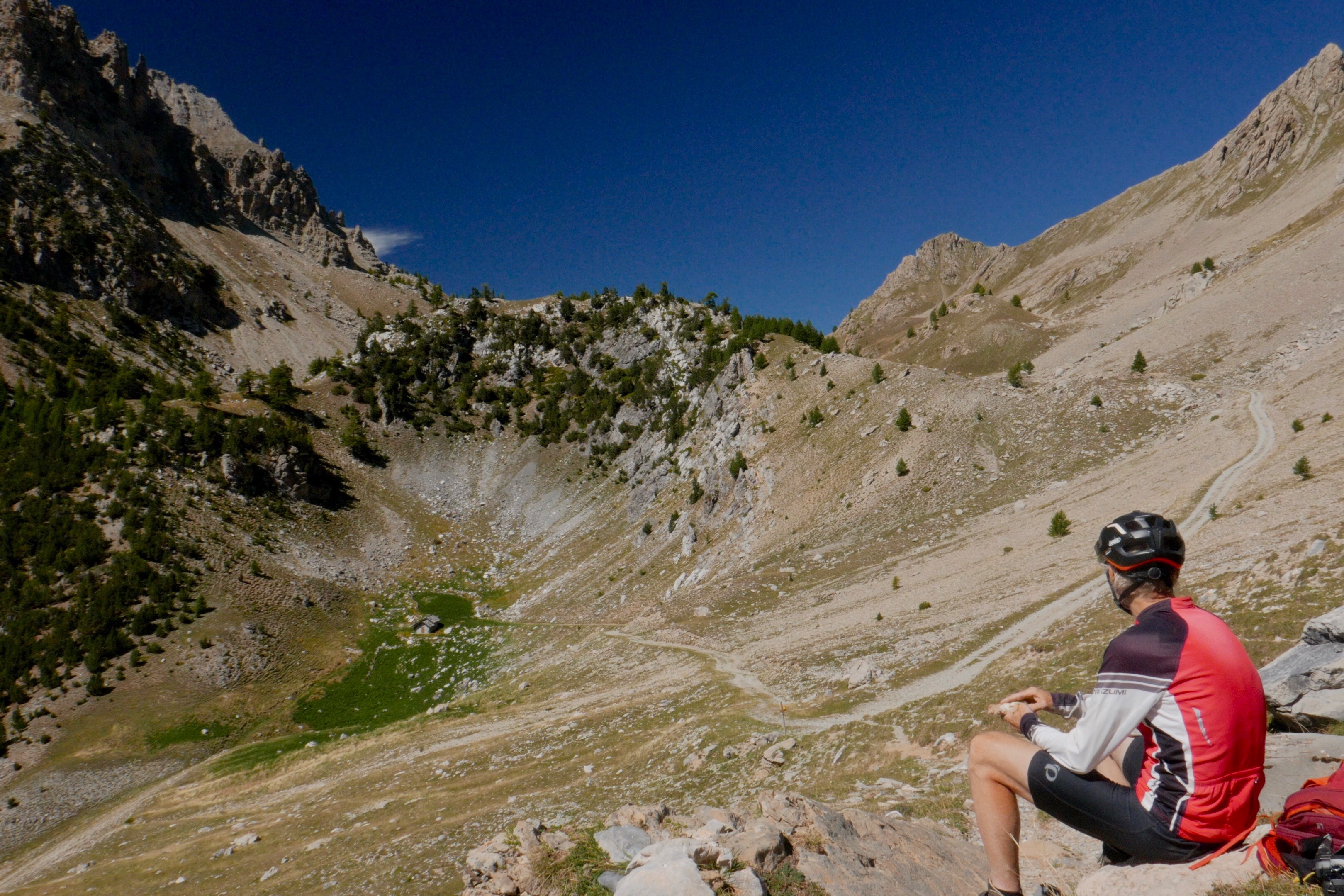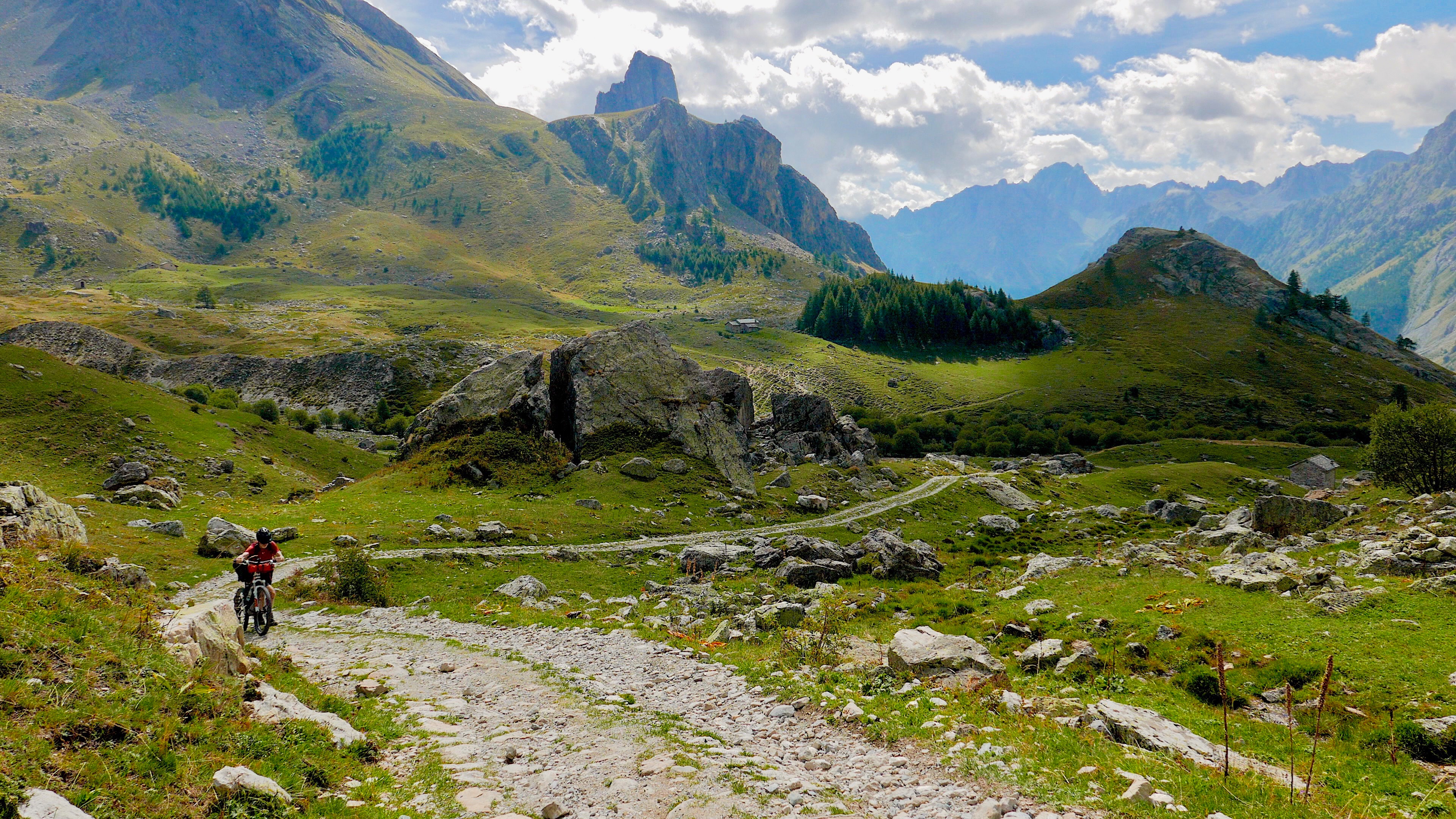 Over een mountainbikeroute daal ik af naar Acceglio,, om daarna weer bergop te gaan. In een opwelling besluit ik het asfalt in te ruilen voor een aantrekkelijk uitziend onverhard weggetje langs de rivier, en later langs de dalwand, waarover ik verder door het dal omhoog klim. Op de overgang naar single track herschik ik mijn bepakking, en begin dan aan de lange hike-a-bike naar de top, die aanvankelijk over alpenweiden voert en redelijk goed te doen is, maar die hogerop steeds lastiger zou worden.