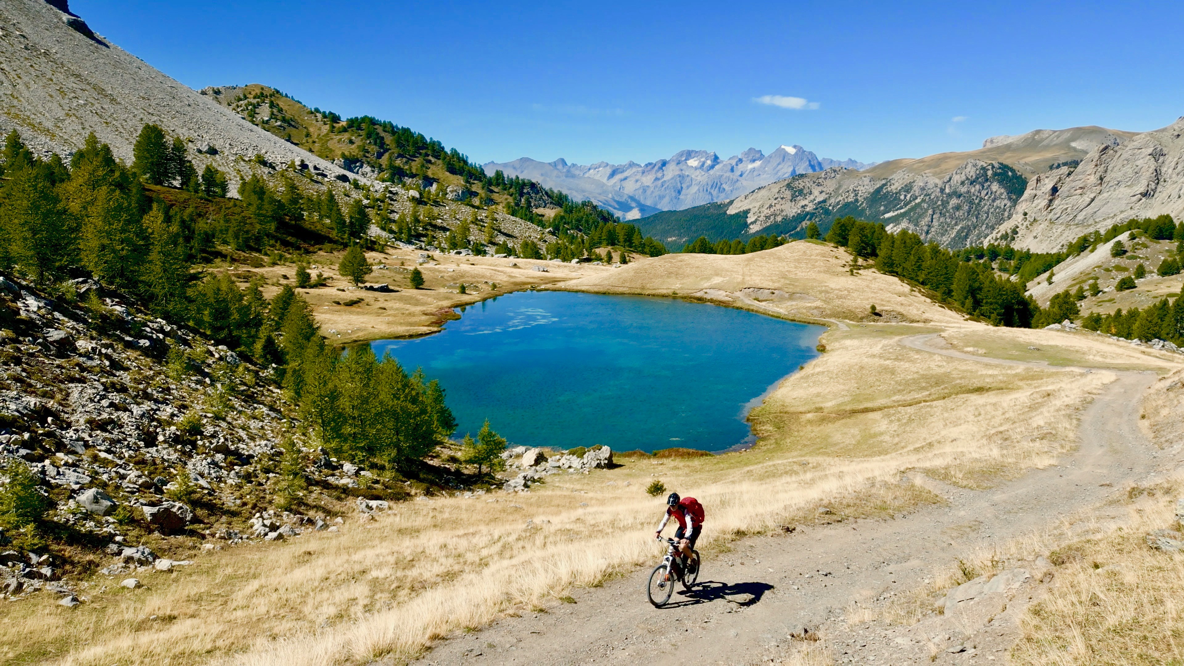 De omgeving is wederom adembenemend mooi. Ik stop om te kijken hoe het vee van de hogere bergalmen wordt afgedreven naar het dal. Een paar honden zorgt ervoor dat de lange sliert blonde koeien in beweging blijft; hun geblaf echoot door de verder stille bergwereld. Het laatste gedeelte van de klim is erg steil en rotsig, en kost veel kracht. Mijn fiets is slechts nog nutteloze ballast. Dood gewicht. Dat verandert gelukkig zodra ik weer omlaag mag; het eerste stuk van de afdaling is een waar feest, maar lang duurt dat niet. Als het pad de puinwaaiers kiest wordt ook de afdaling een gevecht. Soms hardgrondig vloekend til, duw, trek en sleep ik mijn fiets verder omlaag over de rotsblokken. Geregeld komen mijn schenen hard in aanraking met mijn van pinnetjes voorziene pedalen, of anders wel met een scherpe rots. Het bloed komt er in kleine stroompjes langs omlaag. Het Lac du Marinet lijkt onder handbereik, maar ik weel dat het nog wel even zal duren voor ik er mijn kamp kan opslaan. Pas tegen de avondschemering ben ik er. De zonsondergang zet de bergen in een oranje gloed, die zich spiegelt in het rimpelloze water van het meertje. Ik nuttig mijn avondmaal van oud brood met ik weet niet meer wat, in ieder geval iets lang houdbaars, drink met volle teugen van de natuurpracht die me omgeeft en duik dan intens moe mijn warme slaapzak in.